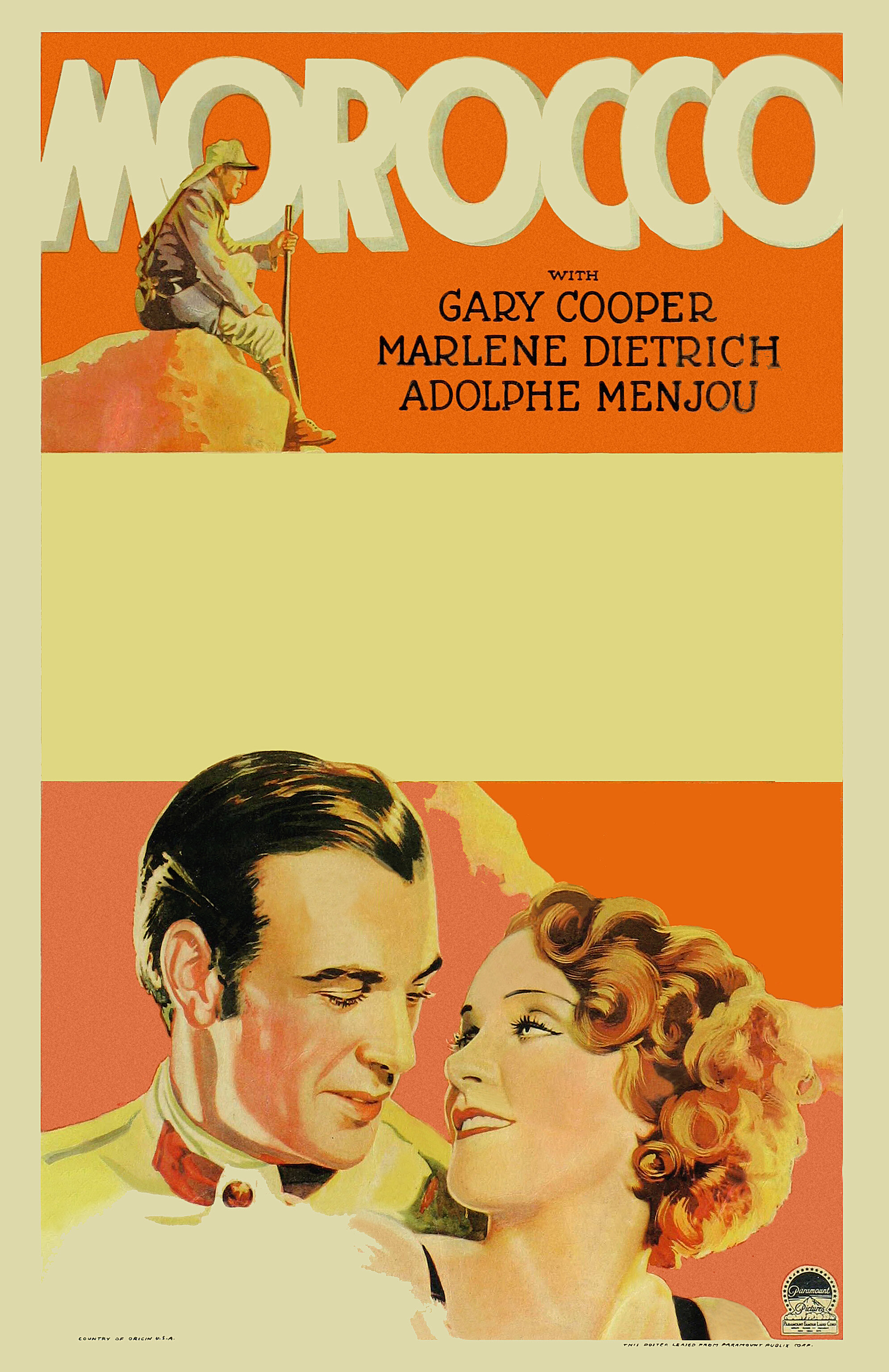 Марокко можно с такой же уверенностью назвать фильмом о войне, сколько и Касабланку Майкла Кертица (действия которой, к слову, тоже происходит в этой стране). К тому же вмешивается непомерно короткий полуторачасовой хронометраж. Скорее это кино, действие которого разворачивается в обстановке надвигающейся бури (но все же непосредственно военно-полевые действия присутствуют). А пока затишье, Йозеф Фон Штернберг уже толкает свою героиню в самое огниво, ставя перед ней тяжелый выбор — жить без забот или жить с любимым.