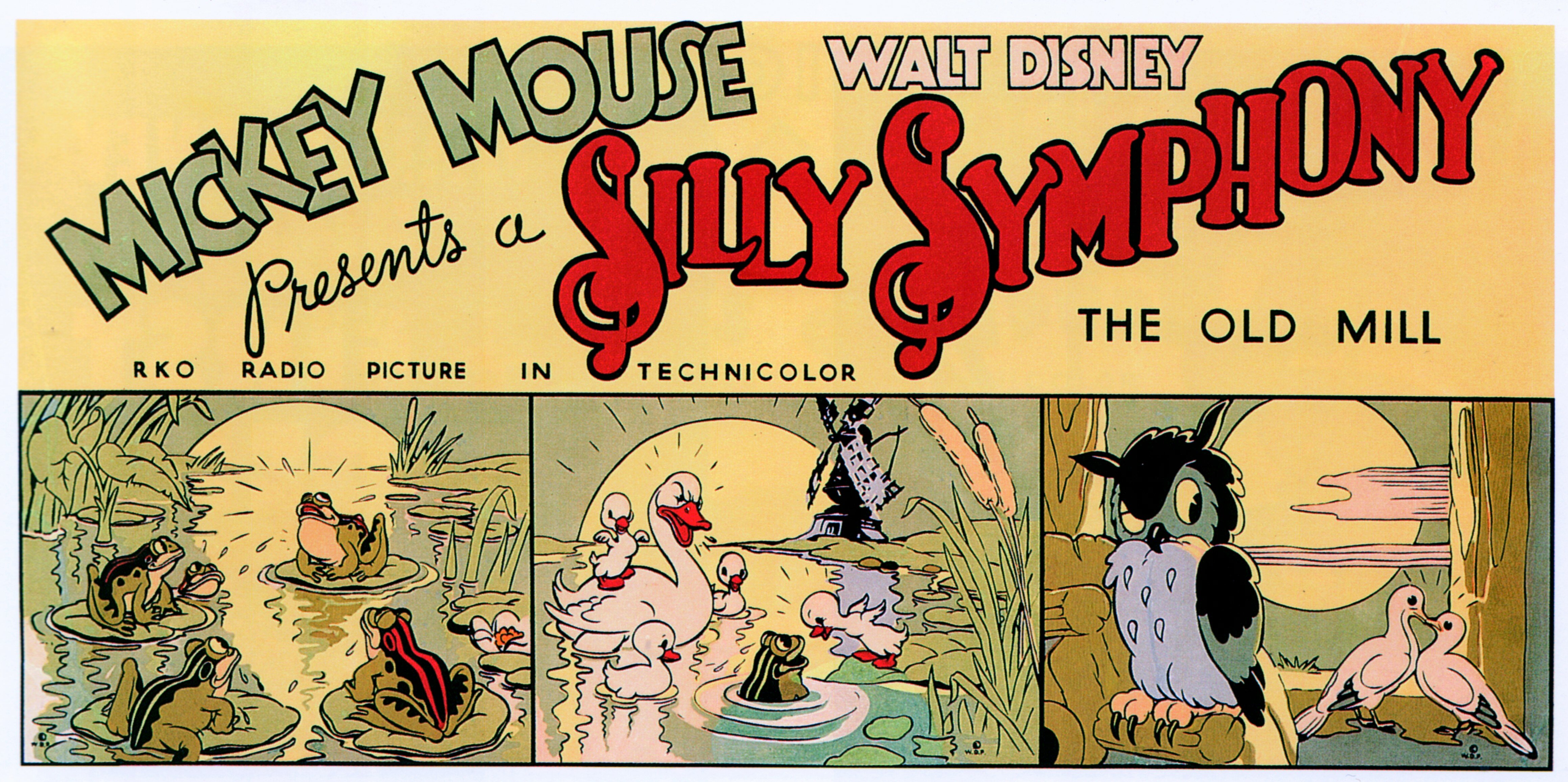 В «Старой мельнице» отчётливо видны многие фундаментальные архетипы будущей киновселенной: гармония прекрасной природы, молодая супружеская пара (воробьи), погружённая в заботы о скором пополнении семейства, более молодая влюблённая пара (голуби), ещё не думающая ни о чём, кроме своего счастья, которое у них «здесь и сейчас», весёлая и беззаботная компания (лягушки), забавляющая зрителей и по-доброму надоедающая остальным действующим лицам истории, старый и мудрый персонаж (филин), с высоты своих лет несколько флегматично относящийся к разворачивающимся вокруг событиям, «моменты саспенса» (появляющиеся из тьмы глаза летучих мышей), разительно отличающие диснеевские мультфильмы (и американский кинематограф в целом) от остальных кинематографических школ мира…