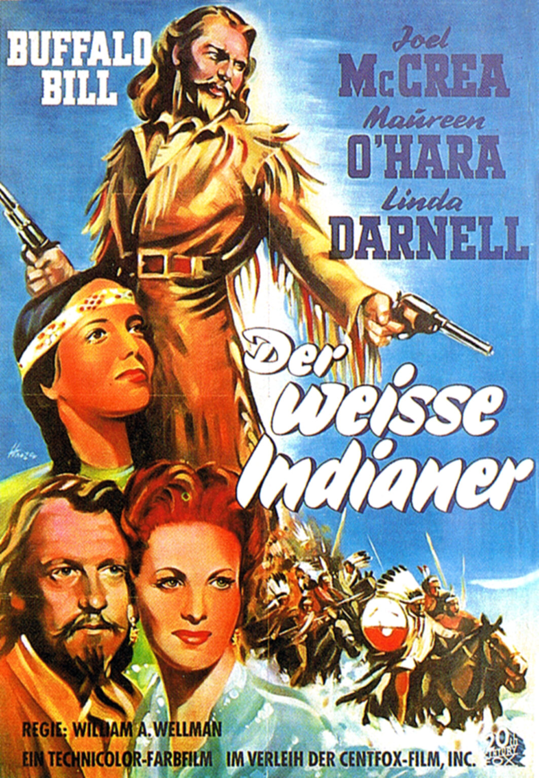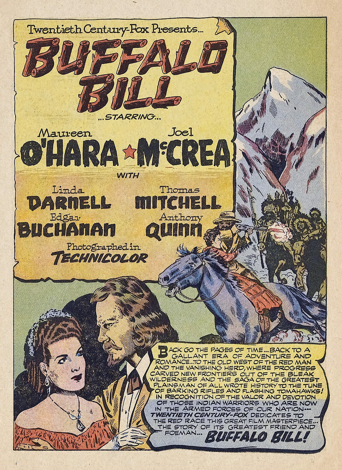 В канве повествования — жизнь Билла с молодых лет и до самых его седин. Дружба с индейцами, шоу с бизонами, женитьба, рождения сына… и затем потеря его. В общем, все победы и разочарования человека. Убедительно в роли Билла смотрелся Джоэль МакКри. Я таким и представлял Буффало, особенно, в старости (когда под воздействием грима у нашего героя появились седые волосы и редкие морщины). Энтони Куинн со своим мексиканским происхождением (и крутой внешностью) удачно вписался в роль индейца по прозвищу «Белая Рука» — близкого друга, но потом — врага Буффало Билла. Нельзя не отметить и женскую половину. Рыжеволосая холодная красавица Морин О’Хара хорошо смотрелась в роли верной жены Билла. А утончённая хорошенькая брюнетка Линда Дарнелл идеально подошла на роль сестры «Белой Руки» — былой возлюбленной Билла.