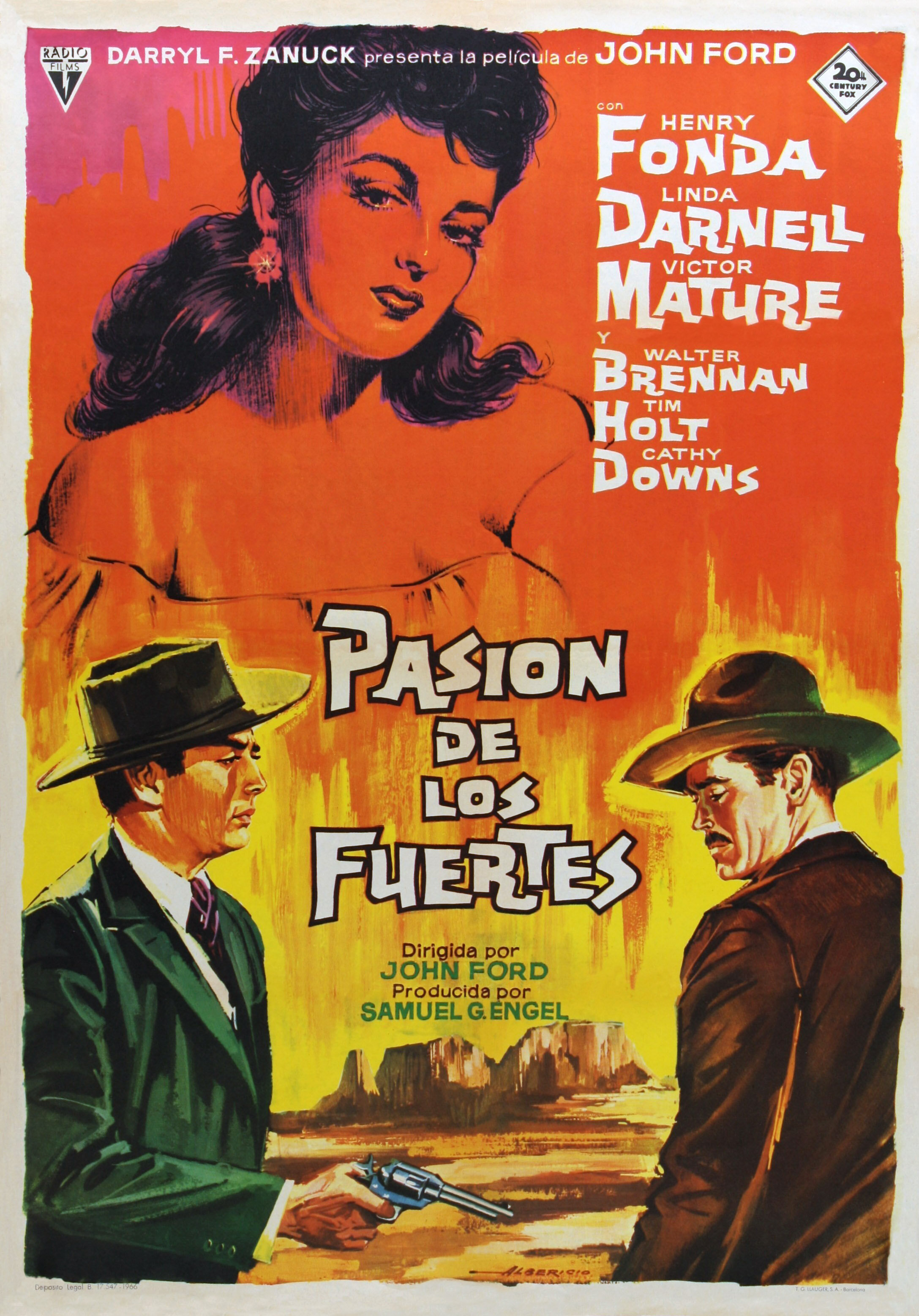 Первый фильм, в котором снялся Генри Фонда после войны. Он играет настоящую легенду Запада Уайетта Эрпа. Роль стала одной из знаковых для Фонды, но все же мне несколько не хватило глубины характера персонажа (ну еще с усами Генри все-таки не очень смотрится). Зато мощно выступил Виктор Мэтьюр, внешне по фактуре, казалось бы, не очень подходивший на роль туберкулезника и алкоголика Дока Холлидея. Его персонаж, своего рода герой античной трагедии с сумрачным взором и фатальными мыслями о себе.