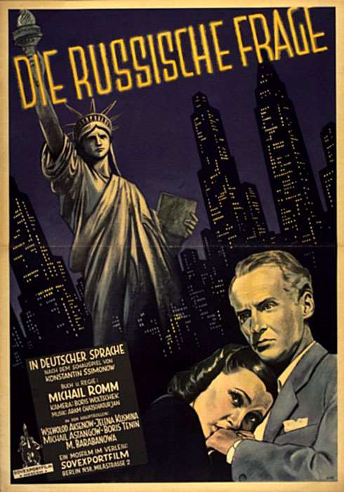 Ответу на это и посвящён кинофильм «Русский вопрос» режиссера М. Ромма. Почти всё действие в кинокартине происходит в Америке. Журналист Гарри Смит получает от владельца газеты задание — поехать в Советский Союз и написать книгу об отношении русских к войне. Получает он это задание не случайно. Смит был в России в 1942 году и наблюдал за героизмом советских людей в Сталинградской битве, а в том же году выпустил и книгу, в которой о Советском Союзе он отзывался в восторженных выражениях. Книга имела большой успех у читателей, поэтому именно он (по замыслу нынешних поджигателей войны) должен создать новое произведение на старую тему, но с совершенно противоположным отношением к русским людям.