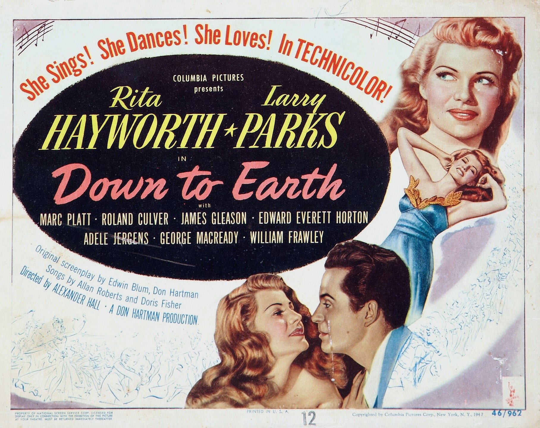 Рита Хэйворт — лично меня абсолютно не удивил тот факт, что роль богини Терпсихоры играет именно она. Актриса являлась одним из главных секс-символов США в 40-е годы. Но в отличии от Джин Харлоу или Мэрилин Монро, карьера которых строилась лишь на внешних данных, Рита Хэйворт очень талантливая актриса. Она обладает великолепной пластичностью, хорошей мимикой и умением точно передавать чувства своей героини. Не будем забывать, что она великолепная танцовщица. К сожалению, в отношении вокальных данных актриса оказалась не сильна (пение дублирует Анита Эллис), но на фоне вышеперечисленных достоинств — этот недостаток ничего не значит! А сыграла и станцевала Хэйворт на все 100!
