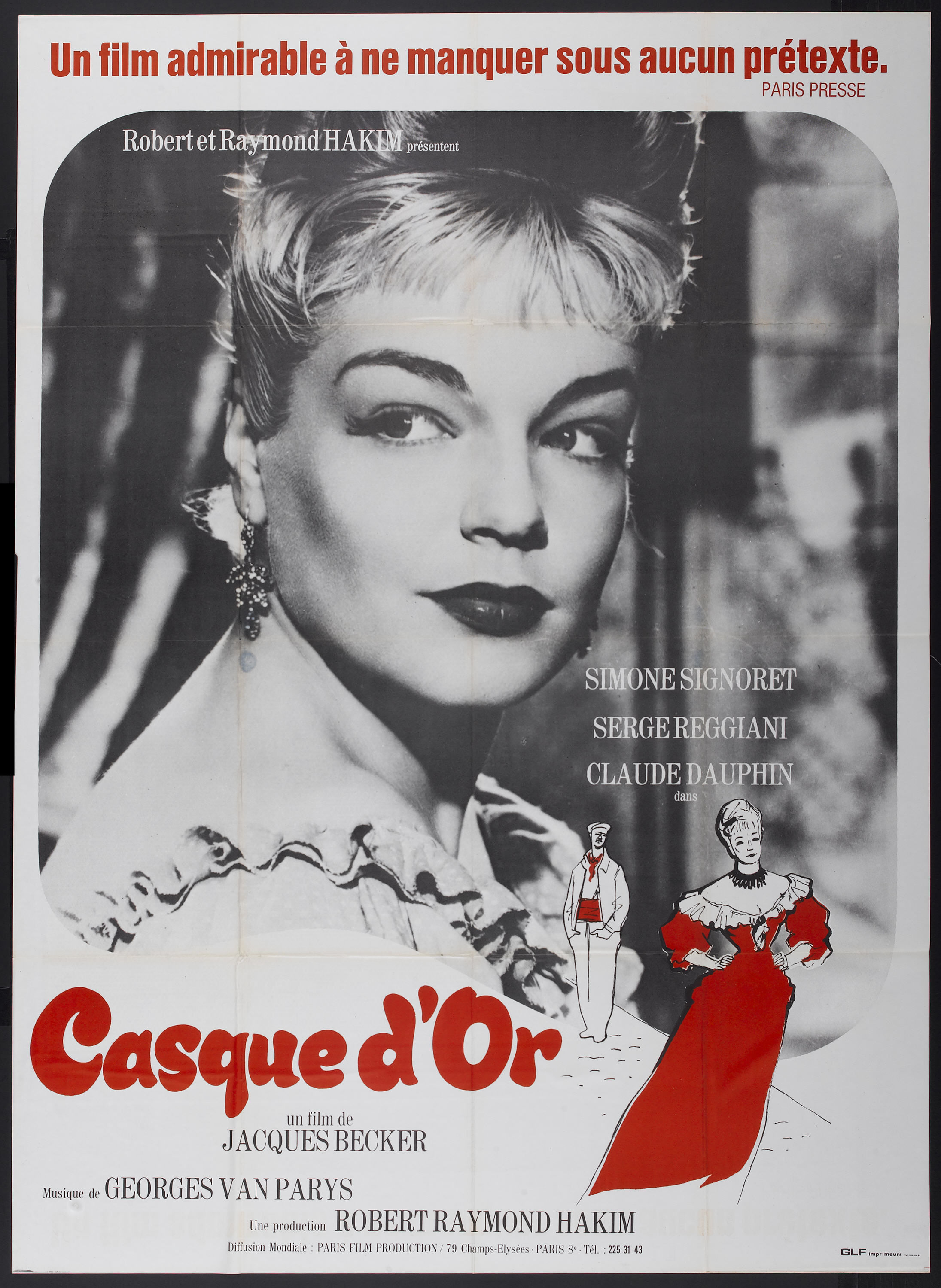«Сюжет… Как вам сказать? Сюжет не новый… Любовь, убийство» — цитату русского классика можно отнести и к «Золотой каске». Сюжетная линия, с первого взгляда, совсем простая и лёгкая на восприятие, содержит и поучительные уроки, и примечательные мысли и актуальные даже на сегодня примеры: любовь и дружба важнее денег, роскоши, славы и власти. Откопав в судебных отчетах прошлых столетий криминальную историю, бывший ассистент Ренуара Жак Беккер нацелился поставить по ней визуально выверенный и атмосферный фильм. На главную женскую роль он позвал Симону Синьоре. Ах, Симона! — прекрасная и несчастная, познавшая и любовь, и неверность, и почет, и хулу — будут в ее жизни еще и путь наверх, и признание публики, но будут и удары судьбы, будет и дуэль: алкоголь — ее Дантес. Все это будет потом. Но здесь — в этой киноленте — она прекрасна как морской рассвет. Пусть и не королева красоты, пусть ширококостна, пусть и не для каждого девушка мечты, но как можно не сопереживать ее героине: уже было разочаровавшейся в любви женщине, нашедшей свою любовь. Несмотря на порочное прошлое, Мари удалось сохранить свет в душе, который она и мечтает пролить на смешного усача — персонажа, поначалу вызывающего скептическое отношение, но если призадуматься, присмотреться, то становится понятно: пресытившуюся похотью женщину не интересуют жаждущие плотских утех сладострастники в дорогих костюмах, щегольски закручивающие ус. Ее возлюбленный — плотник, пусть с криминальным прошлым, — верящий в любовь идеалист. Он не безнадежный романтик, но готов отдаться целиком страсти, стремясь, как и сама Мари, распроститься с прежней жизнью.