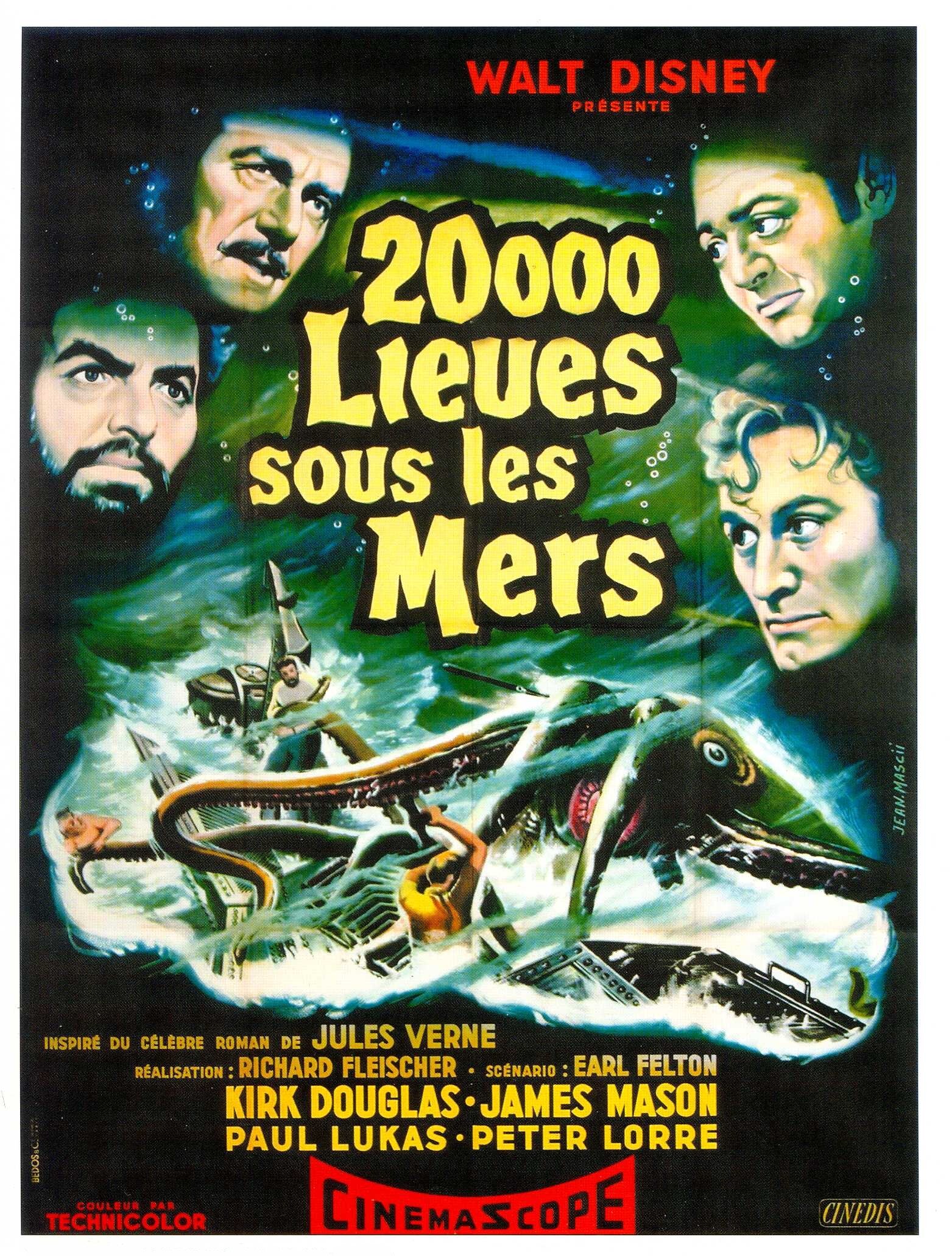 В картине красиво стилизуются технологии съёмки субмарины «Наутилус», которые переплетаются между собой: это надо и изобразить на экране, и сопоставить подводную жизнь с техническим совершенством капитана Немо, исполняемого Джеймсом Мейсоном. Для более близкого знакомства сюжет отправляет военное судно именно на поиски чудовища. Столкновение с «Наутилусом» представляет собой прямое влияние антагониста всего фильма, это не просто случайное нападение, это битва в океане, которая завершается спасением утопающих (дело рук самих утопающих) и знакомством с буйным Кирком Дугласом - китоловом, Полом Лукасом - профессором Ароннаксом и его советником в лице Петера Лорре - вот уж «М» - убийца всплыл из нуара в морские просторы.