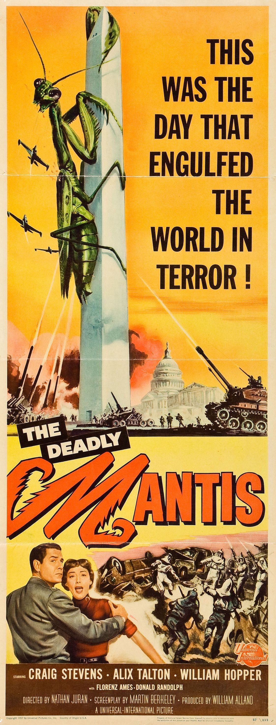 В данном случае речь пойдет про фильм 1957 года,«Смертельный богомол». Про доисторического богомола, что пробудился от многовековой спячки и занялся тем, чем обычно занимаются монстры в голливудских фильмах. Полетел громить города США. Если быть честным, то фильм выделяется из массы подобных только грамотной режиссурой и некоторым нагнетанием атмосферы, которую напрочь убивает банальная концовка. Он не столь динамичен как «Тарантула», 1958 года. Нет социального подтекста, что был в фильме Гордона Дугласа «Они» (1954). Где была поднята проблема опасности испытаний ядерного оружия. Это просто крепкая вариация на тему. Легкая, без особых изысков картина, не лишена некого шарма и вызывающая у любителей фантастики 50-тых приятные чувства.