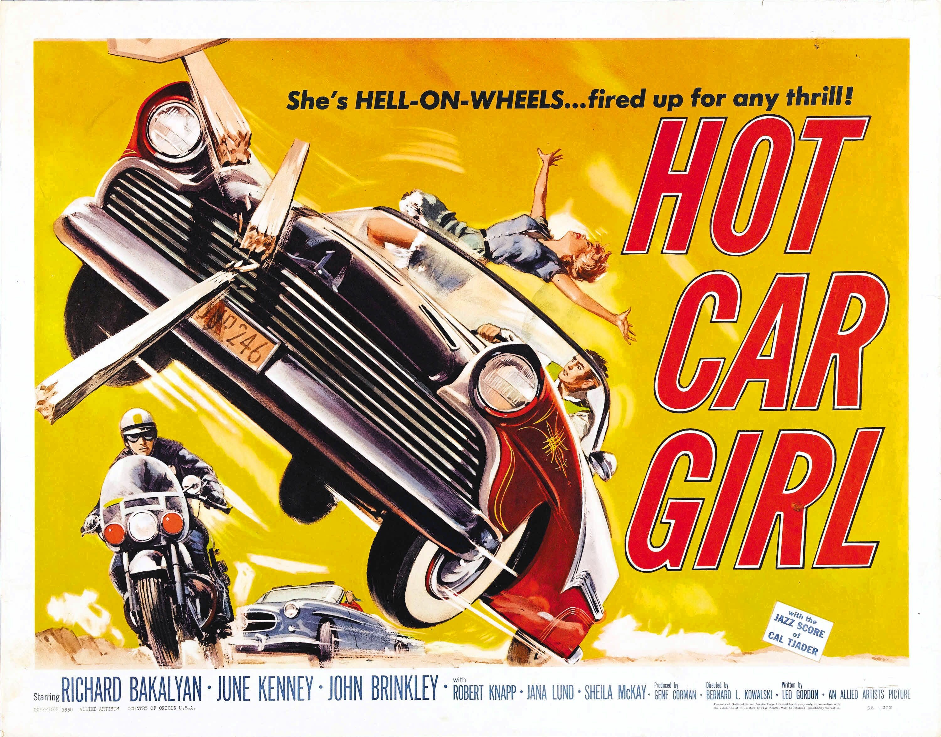 Киноиндустрия, столкнувшаяся с падением числа посетителей кинотеатров, быстро уловила тренд и начала снимать бесчисленное множество малобюджетных криминальных драм о подростковой преступности, герои которых угоняли автомобили, грабили банки и даже убивали полицейских. Всем этим занимаются и персонажи фильма Бернарда Ковальски «Горячая девушка в автомобиле», который вышел на экраны в 1958 году. Стоит заметить, что одним из продюсеров фильма был Роджер Корман — культовый персонаж американского кинематографа. Хотя сюжет может показаться интригующим, развитие действия выглядит весьма предсказуемым, а финал подтверждает, что плохие поступки обязательно будут наказаны. В целом картина представляет только историческую ценность, будучи очень далёкой от лучших образцов жанра.