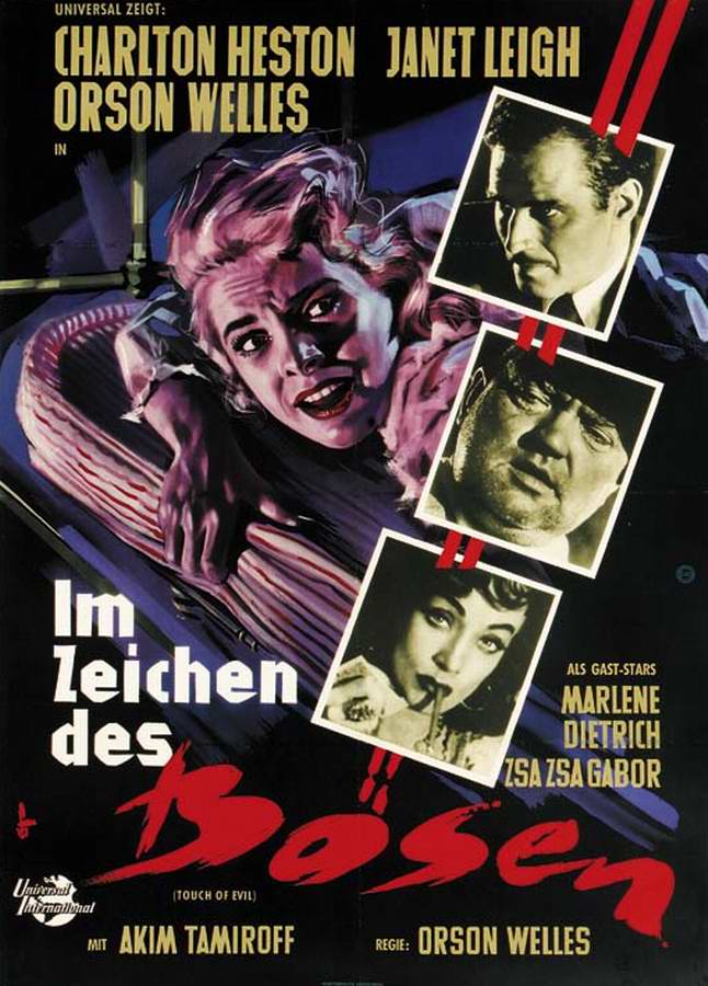 Тематика, конечно же, тоже актуальна. Взяточничество, коррумпированные полицейские, наркотический дурман, в который погружают жертв… о, это и сейчас всем понятно и является крайне острым и щекотливым! А об остальном грамотно позаботится актёрский состав. Орсон Уэллс - собственной персоной. Чарлтон Хестон, в кинематографе известный по роли Иуды Бен-Гура. Джанет Ли, потом наиболее проявившая себя в эпохальном «Психо» Хичкока. Рельефные скулы Марлен Дитрих… о, если многие части её лица неподвижны, то это лишь затем, чтобы другие приобретали несказанную выразительность! В общем, этот нуарный триллер стоит посмотреть уже даже хотя бы из-за антуража и звёзд, в нём снимавшихся.