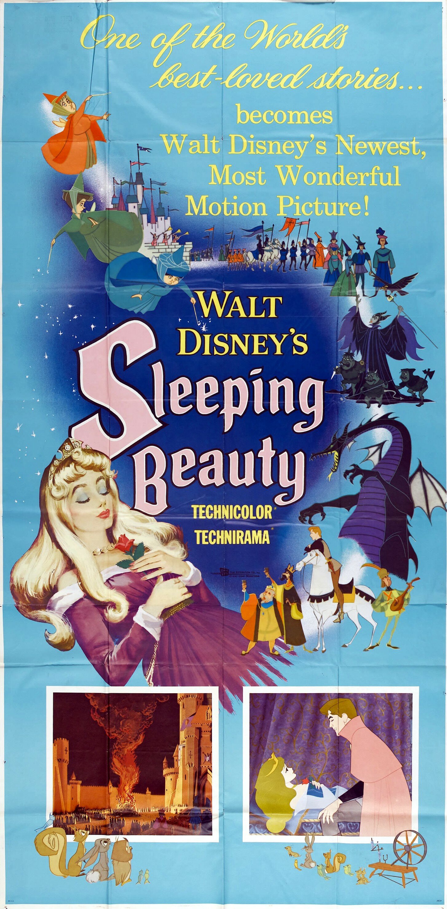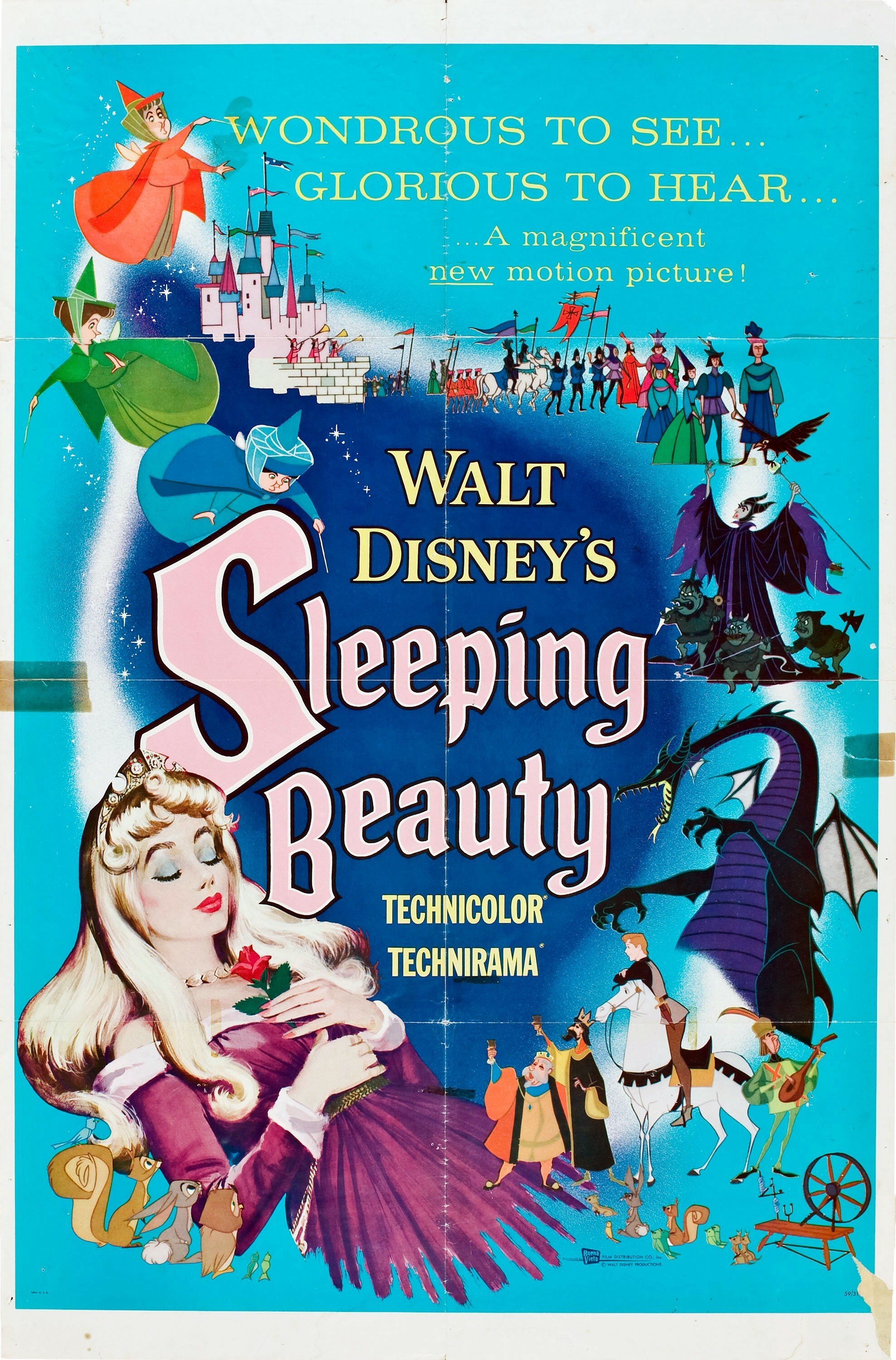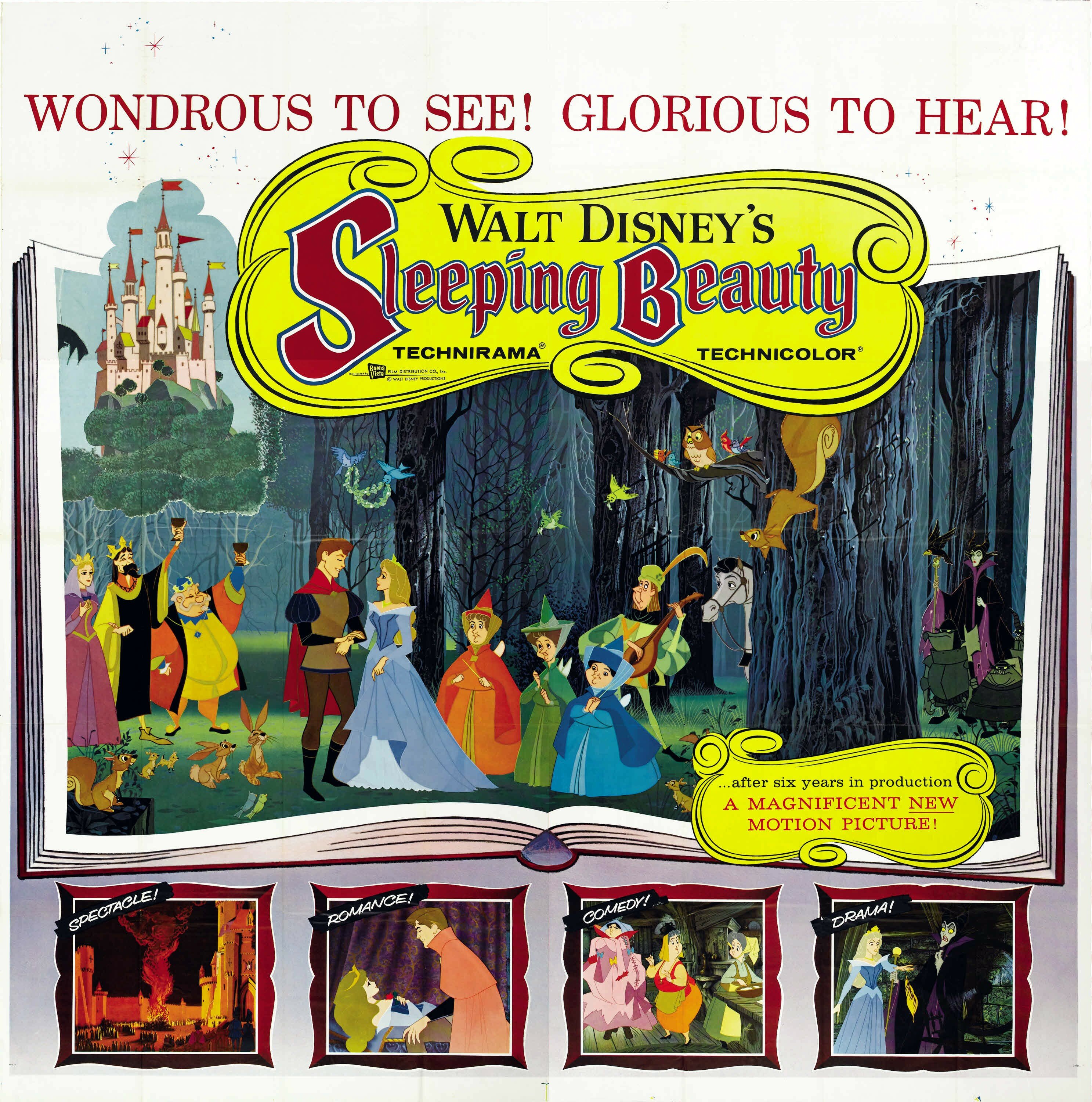 По наставлению Уолта Диснея принцесса Аврора действительно отличается от своих сказочных подруг, Белоснежки и Золушки тем, что ее всю сознательную жизнь воспитывали феи, да и сама она проживала в лесу, то бишь вдали от королевства, большого города и общества, которое не всегда приносит пользу. Поэтому из Авроры получилась искренняя, жизнерадостная и добрая девушка, за которую зритель искренне переживает, ведь она априори не может сделать никому плохо. Конечно, подобный образ получился слишком идеализированным, однако не стоит забывать о том, что «Спящая красавица» должна была с головой захватить воображение юных зрителей и у нее это получилось в наилучшем виде. Произошло это не в последнюю очередь из-за тщательной, многогранной и необычайной технологии рисовки, которая с одной стороны исполняла классические заветы студии, а с другой использовала интригующее сочетание мотивов Готики и Ренессанса. Уолт Дисней самолично курировал работу Джероними и прочих режиссеров, находящихся в его ведении, дабы даже взрослые зрители испытывали трепет во время наиболее напряженных, драматических эпизодов, необычайно сочетающихся с жизнерадостными сюжетными моментами. Так что вся «Спящая красавица» находилась во власти прямо противоположных эмоциональных всплесков, которые во многом и сделали ее той сказкой, которой восхищаешься как в юном возрасте, так и зрелом. И каждый раз ты обращаешь внимание на некие новые нюансы, которые ранее находились на периферии. Скажем, та же волшебница Малефисента благодаря своим грозным, напыщенным и отчасти трагическим монологам, со временем стала восприниматься не настолько однозначно, скрывая за холодной ненавистью к королевской семьи нечто большее и таинственное, впоследствии раскрытое в полнометражном блокбастере эпохи римейков от Disney.