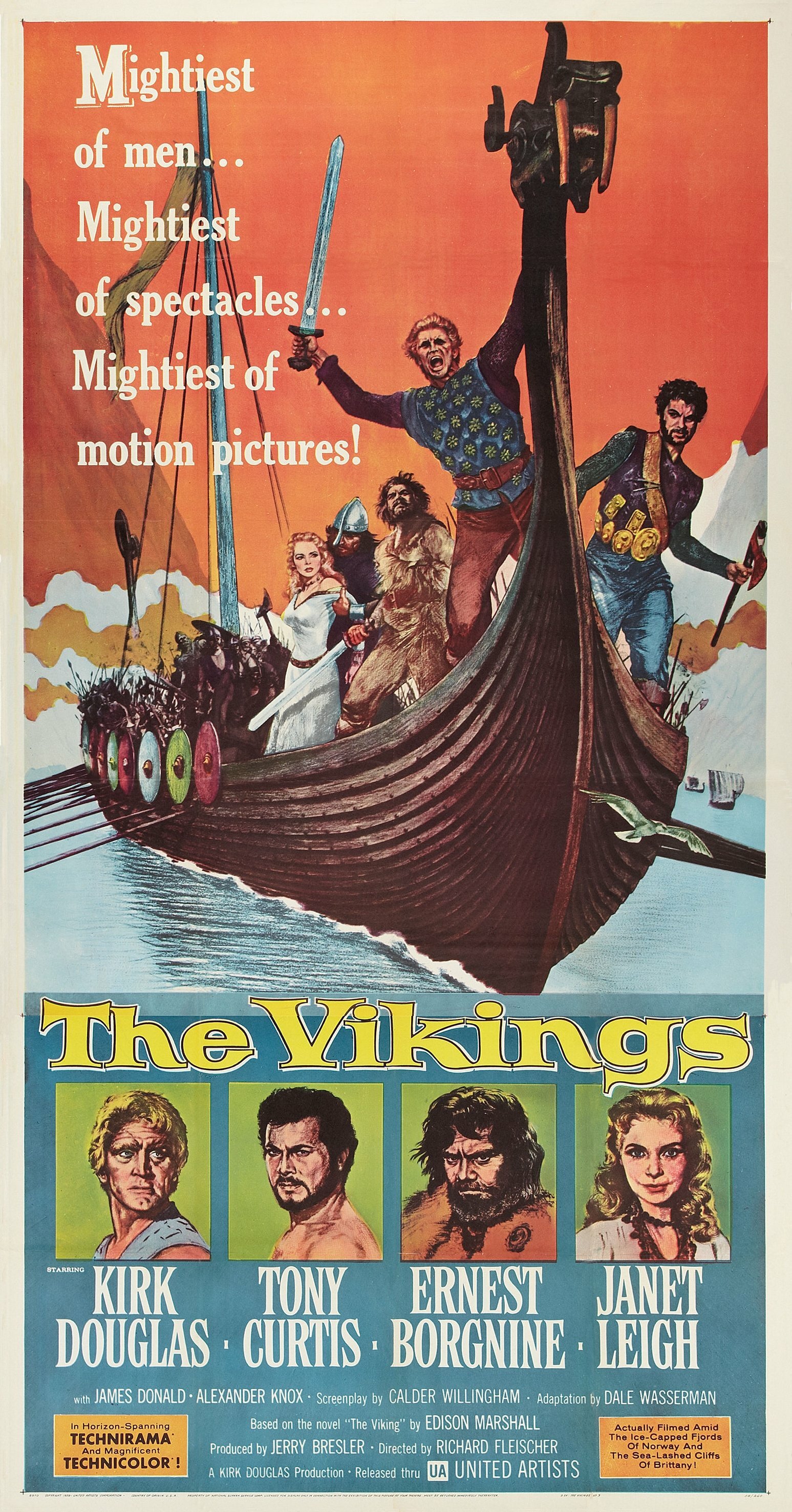 Да, вы правы, сейчас я начну доказывать, что в прошлом веке и халва была слаще, и норвежские фьорды глубже, и кинозвезды ослепительнее. Фильм «Викинги’’, двоюродный брат ‘’ Клеопатры’’, ‘’Спартака’’ и ‘’Бен Гура’’, является пособием для режиссеров, собирающихся снимать развлекательное историческое кино. Для этого абсолютно необязательно зацикливаться на скрупулезном описании действительных исторических событий и личностей. Хватит и одного, в данном случае короля Нортумбрии Аэллы Второго. Остальные персонажи выдуманы или Эдисоном Маршалом, автором одноименного романа, или голливудскими сценаристами. Перечисление всех древнескандинавских богов было бы утомительным, и поэтому оставлен только великий и могучий Один, да вскользь упомянуты его дочери на колесницах, запряженных то ли котами, то ли козлами. Зато драккары, на которых викинги активно сеют среди англичан страх, а среди англичанок-свое семя, построены точь-в-точь по реальным образцам, хранящимся в музее викингов в Норвегии. И быт викингов передан правдоподобно, хотя узкие специалисты ворчат, что шлемы чуток не такие, что из атрибутики, по большому счету, мелькает только изображение Ермунганда, а выбритый викинг-такой же нонсенс, как травоядный волк. Но мы дружно пошлем этих специалистов рыться в пыли архивов и археологических раскопок, потому что знаем, что главное в хорошем историческом кино-это яркие персонажи и захватывающий сюжет.