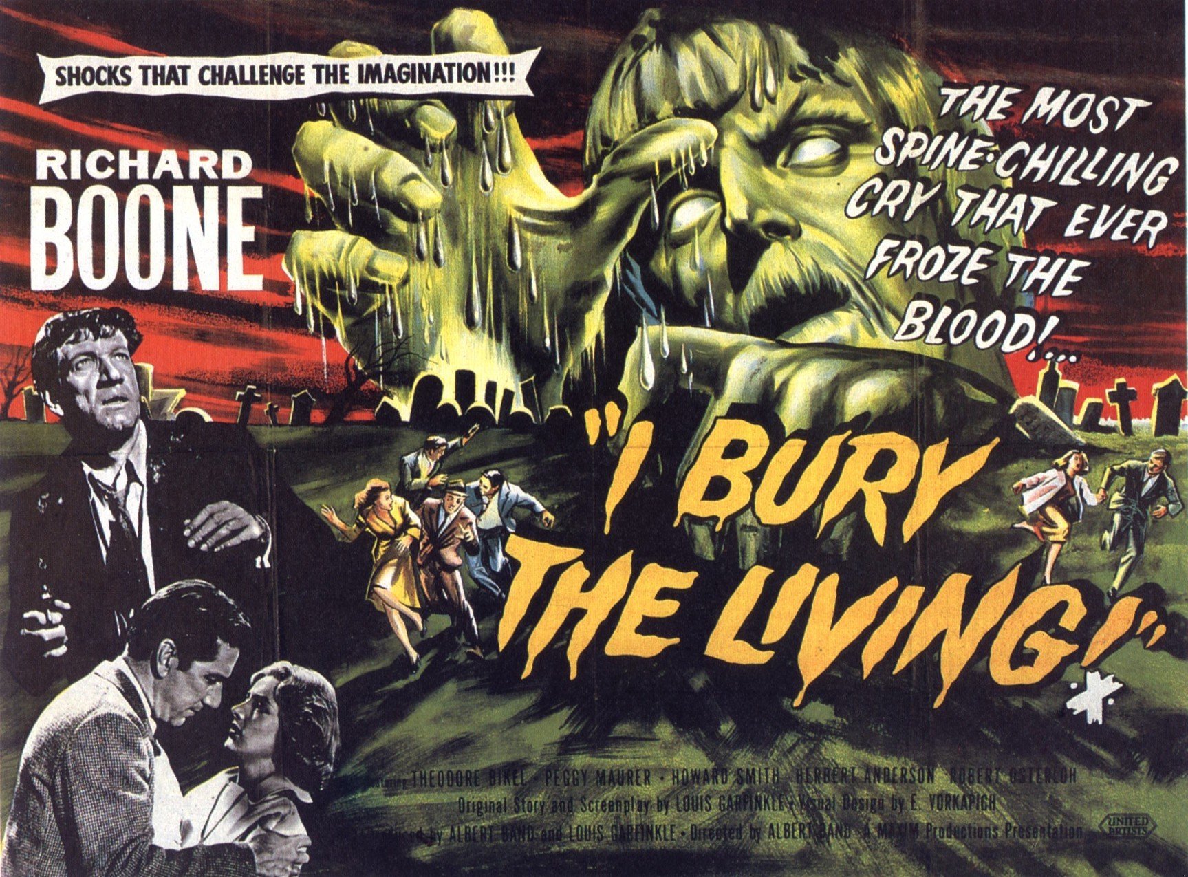 Та же история и с «Я хороню живых» — страшна не «картинка», но ситуация, в которую попадает герой Ричарда Буна. Успешный бизнесмен Роберт Крафт назначен временным председателем комитета, контролирующего работу городского кладбища. У Роберта хватает собственных дел, и он пытается отказаться от должности, но вынужден отступить, когда дядя напоминает, что такова семейная традиция. На кладбище пожилой смотритель показывает Крафту-младшему карту, испещрённую булавками — чёрными, если могила занята, и белыми, если место выкуплено, но пока пустует. В первый же день Роберт допускает оплошность, отметив не тем цветом два будущих захоронения — а вскоре молодожёны, которым они предназначались, погибают в автомобильной катастрофе. Следом умирает ещё один человек, получивший «не ту» булавку. Жизнь Роберта, измученного чувством вины, превращается в непреходящий кошмар.