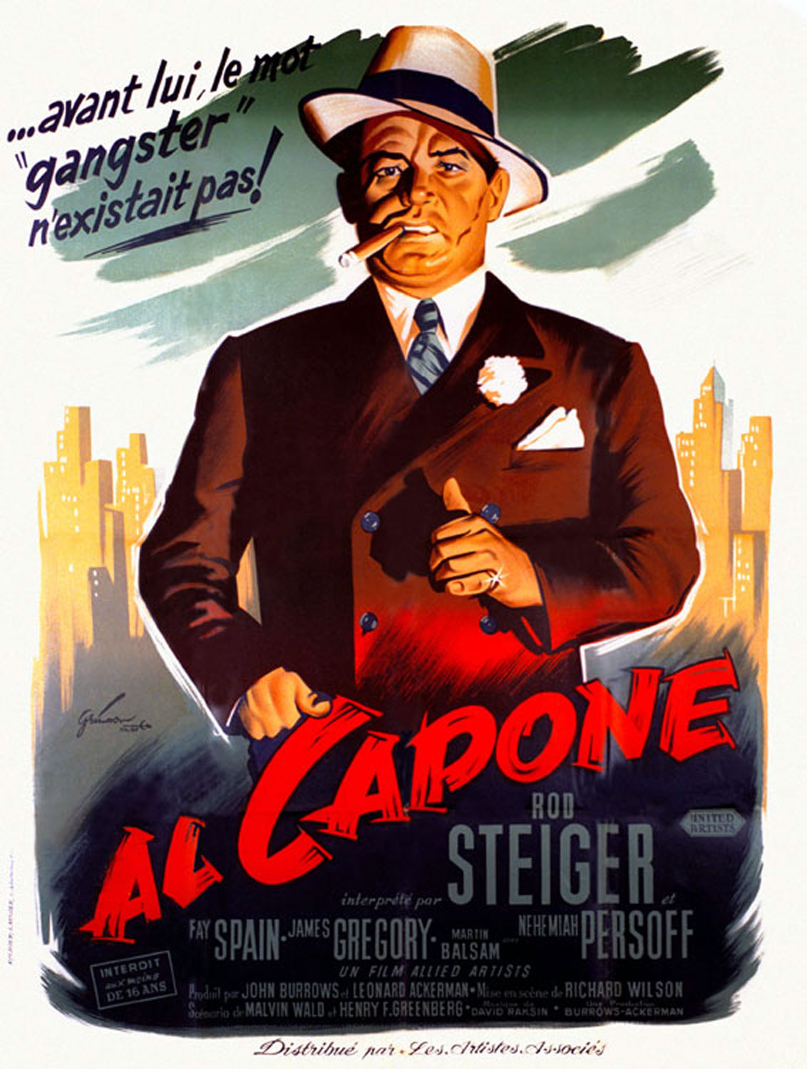 Название фильма «Аль Капоне» полностью отражает происходящее на экране. Авторы сконцентрировались на главном персонаже и показали историю именно о нем, лишь в общих чертах познакомив с окружающей его средой и людьми. История эта начинается с приездом Аль Капоне на заработки в «Чикаго» к своему родственнику. Благодаря ему Капоне очень быстро вошел в круг влиятельных людей города, затем, почувствовав вкус власти, Аль Капоне принимает на себя полномочия босса мафии с кучей врагов. Род Стайгер отлично показывает Аль Капоне, каким он мог бы быть. Его игра вызывает симпатию, может правда где то и переигрывает итальянца. Присутствует несколько сцен где он говорит с набитым едой ртом, по моему такого хода в кино 50-х годов не использовали до этого или не было принято.