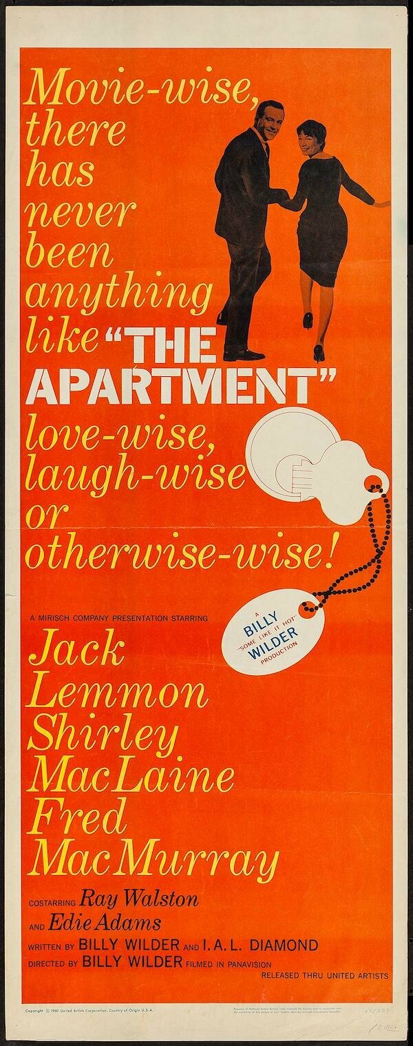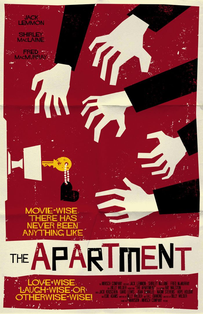 Сюжет: Бакстер — клерк-терпила из страховой компании; он одалживает стоящим выше по карьерной лестнице ключ от снимаемой квартиры, надеясь получить от них рекомендации для повышения по службе, обещаниями о чем они его кормят. В конце концов эта история доходит до главного чувака в их компании. И начинается классический любовный треугольник с боссом, гг и чертовски привлекательной лифтершей (которую шефу тоже надо куда-то водить). Для босса она — очередная пассия, но гг серьезно в нее влюбляется, именно влюбляется, а не вспыхивает страстью, поскольку заботится о ее счастье, зная, что она его не любит, а любит шефа.