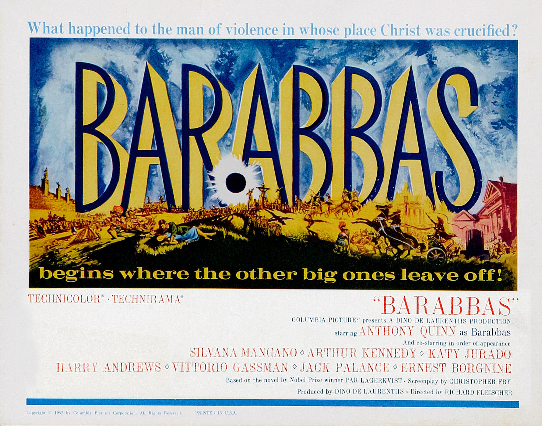 Идея экранизировать фантазию Пера Лагерквиста на тему дальнейшей судьбы эпизодического персонажа Евангелий, буквально витала в воздухе. На рубеже 1950—1960-х гг. студия «Чинечитта» снимала пеплумы в промышленных масштабах, и Моисеем с Иисусом были для кинозрителей кем-то вроде Человека-паука или Капитана Америки для их потомков. Публика штурмовала кассы, пожилых рабов играли секс-символы итальянского кино и чуть ли не у каждого актера массовки была номинация на Оскар. Околобиблейский опус свежеиспеченного Нобелевского лауреата укладывался в эту схему идеально. Тем удивительнее, что в итоге фильм Ричарда Флейшера выпал из общего ряда. При том же размахе, той же немного наивной дорогостоящей зрелищности, склонной разъедать смыслы, точно ржавчина, он получился иным: под золоченой скорлупой жанра билась живая мысль. Основательно переписав роман (удивительно, но факт, диалоги в фильме получились значительно более выразительными), команда сценаристов сохранила его ориентиры. Вместо суррогатных чудес или высокоморальных размышлений — кропотливое воссоздание позднеантичной эпохи, той каменистой, заросшей терниями почвы по обочинам римских дорог, на которую падали семена Слова.