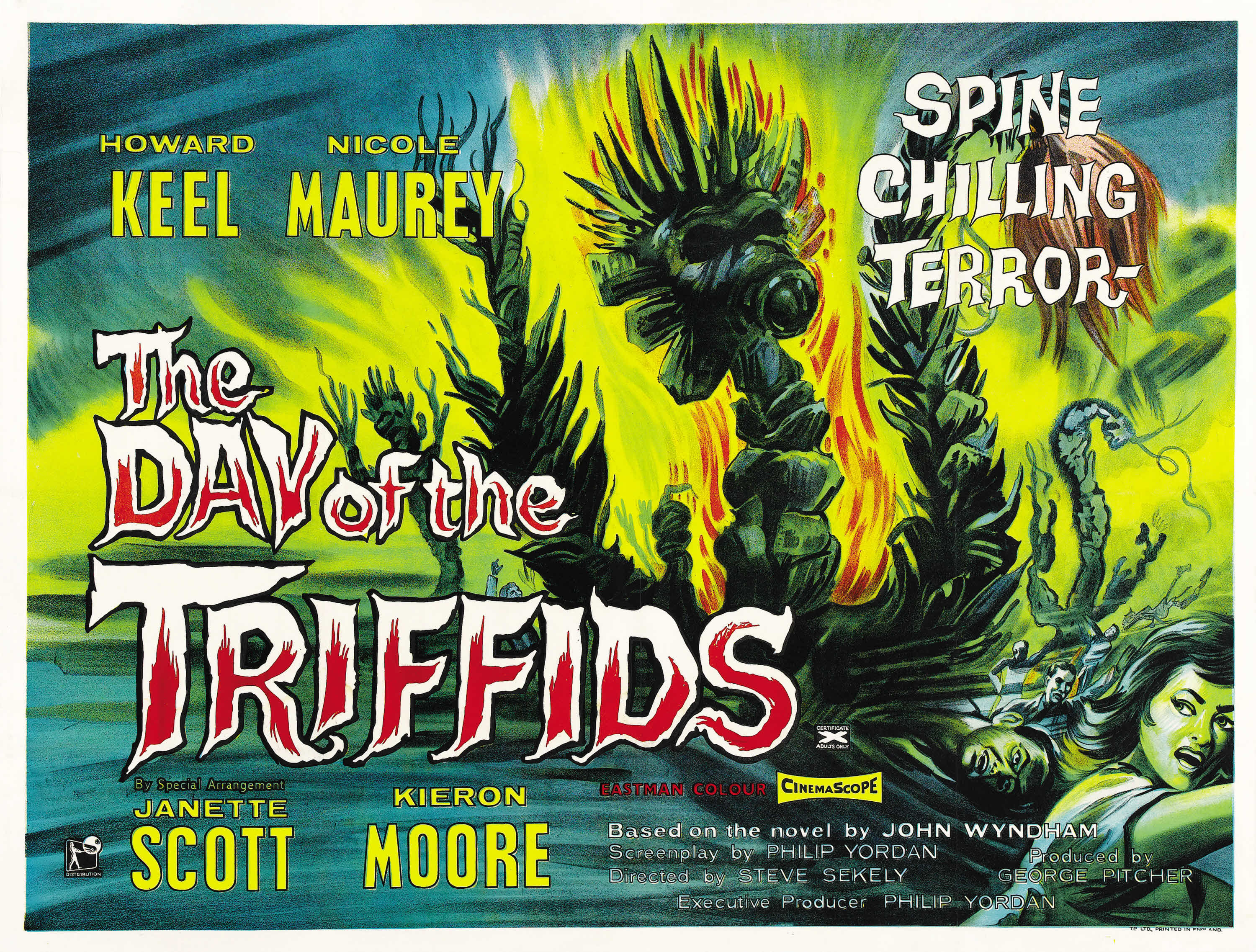 Несмотря на то, что руку к экранизации приложил двукратный [впоследствии] обладатель «Оскара» Фредди Фрэнсис, в целом творческий коллектив для создания фильма собрался весьма невыразительный — в обильном послужном списке его создателей едва ли встретится знакомое Вам имя. В итоге, оригинальная история, охватывающая внушительный промежуток времени и цепочку событий, была неприлично сокращена, сюжет купирован (по сути, перед нами даже не экранизация, а вольная вариация на тему книги**), а мрачная атмосфера оригинала — заменена кровожадным дизайном самих триффидов (не иначе как дедушек похотливого дерева из «Evil Dead»). Там, где Уиндем ставил героев перед сложными моральными дилеммами, и представлял триффидов как разновидность египетской казни для самонадеянной цивилизации всепобедившего разума, авторы фильма явно предпочитают не акцентировать внимание на масштабе катастрофы и даже — возмутительная вольность! — находят проблеме простое решение в духе «природа и провидение сами нас спасут, нужно только ждать, и всё устроится» — как в «Войне миров» Герберта Уэллса или «Роковых яйцах» Михаила Булгакова (правда, в куда более вульгарной форме — мейнстрим что сейчас, что тогда не терпел неоднозначных трактовок). Разумеется, благодаря этому публика выходила из кинотеатров в приподнятом настроении духа, но пафос первоисточника — произведения объективно на века — был трагически утерян.