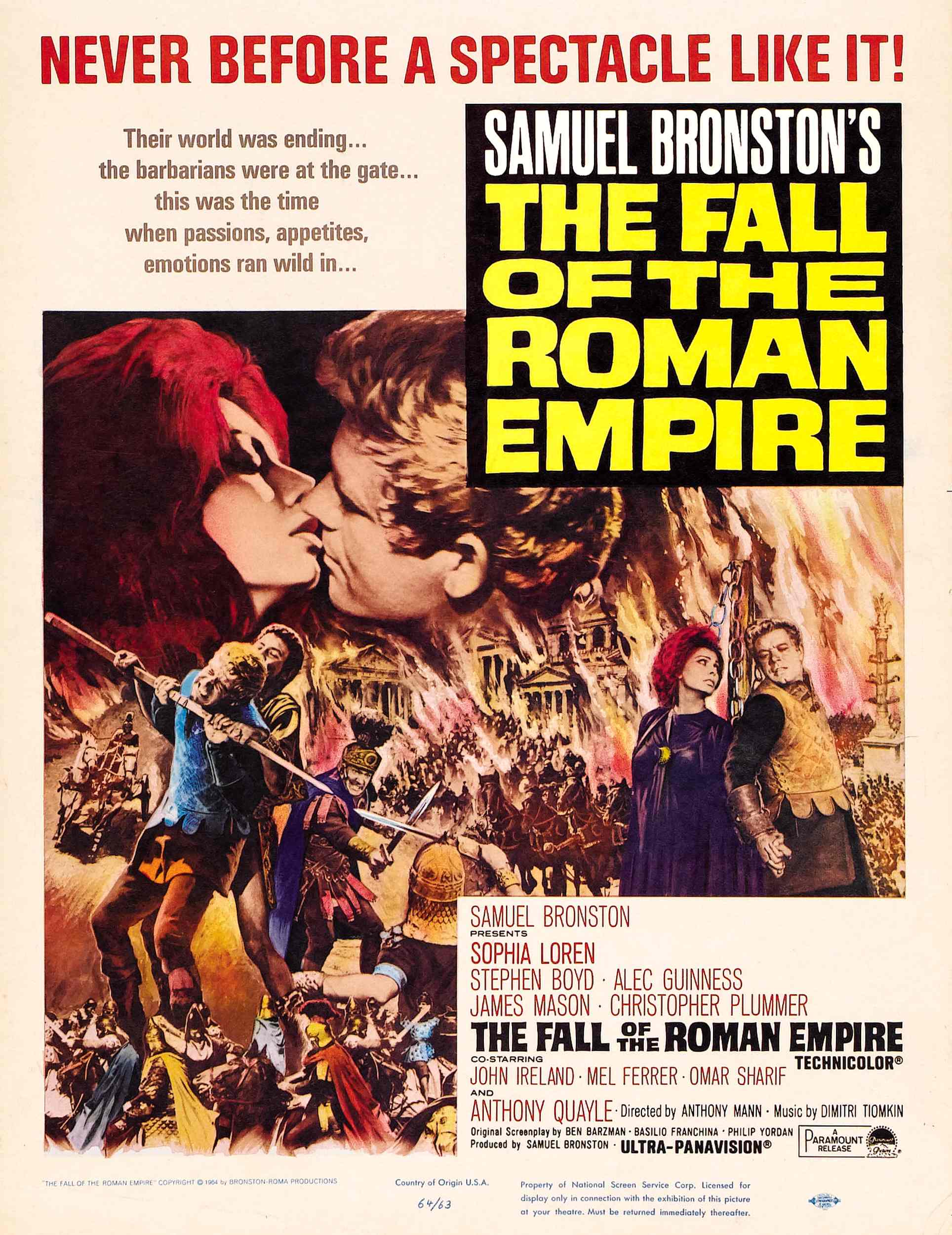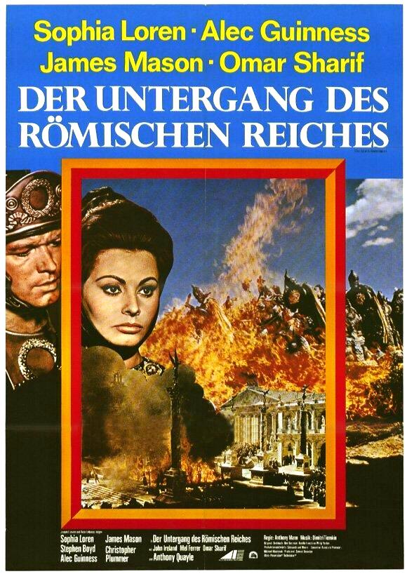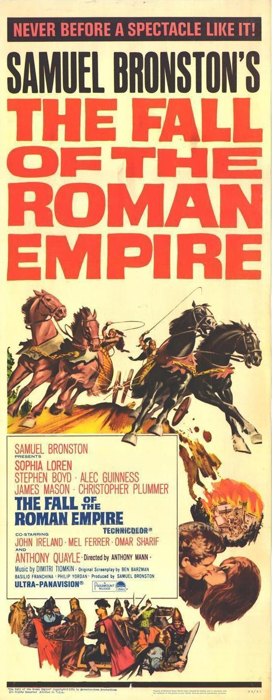 Человечество за всё своё существование пережила, создание, расцвет и распад многих великих империй, союзов, объединённых государств, уничтоженных не внешними угрозами, не врагами из других земель, а своими соотечественниками, главной целью которых были деньги, власть, рабство, история помнит немало подобных печальных примеров : так было с Великой римской империей, так было с Шумером, так было и с СССР. Вся драматичность ситуации не в том, что государство разваливается или нет, а то что большинство людей, живущих в нём не понимают этого, живут как ни в чём не бывало, им неведома честь, им неведома гордость за свою империю, их легко купить за безделушки, выпивку и они продолжают жить, не ведая, что того государства. в котором они жили испокон веку больше нет и никогда не будет. Многие вопросы этой проблематики затрагивает и даже заглядывает в них ещё глубже замечательная историческая драма режиссёра Энтонни Манна «Падение римской империи». Во многом лента своим стилем, манерой подачи, сюжетными особенностями напоминает легендарных «Спартака « и «Клеопатру «, вышедший четырьмя годами позднее 1 фильма и годом второго, плёнка на фоне этих двух «особняковых « фильмов конечно же выглядит на порядок ниже в техническом и визуальном плане, в ней нет таких масштабов и такой профессиональной операторской постановки, но в этом кинопроизведении скрыт более философский смысл, затронуты более глубокие принципы, более подробно задета проблематика внутренних распрей.