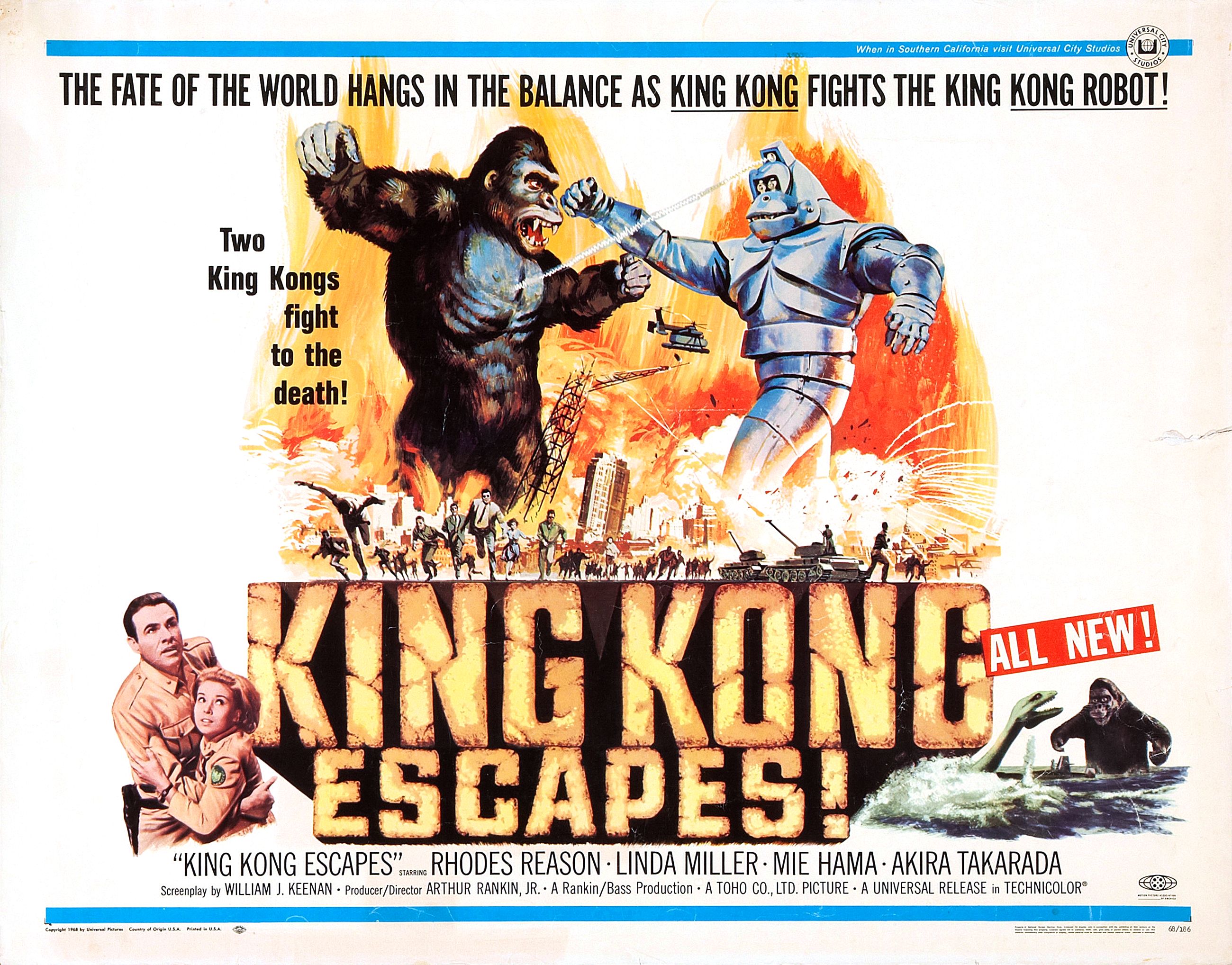 Хотя «Побег Кинг-Конга» тоже рассчитан на детскую аудиторию, он поставлен не столь легкомысленно, как кроссовер. Здесь не находится место для рекламы и бесполезных зрелищ: в основе сюжета лежат политические конфликты — довольно известная тема того времени. Намёки на нестабильность большого мира окутывают мадам Пиранью, представляющую неизвестную нацию, о которой можно лишь догадываться. Ей сопутствует доктор Кто — злодей до мозга костей. Созданный под командованием этого злого гения робот Механи-Конг вызывает живой интерес, ведь он появляется в фильме 1967 года, ещё до Мехагодзиллы.