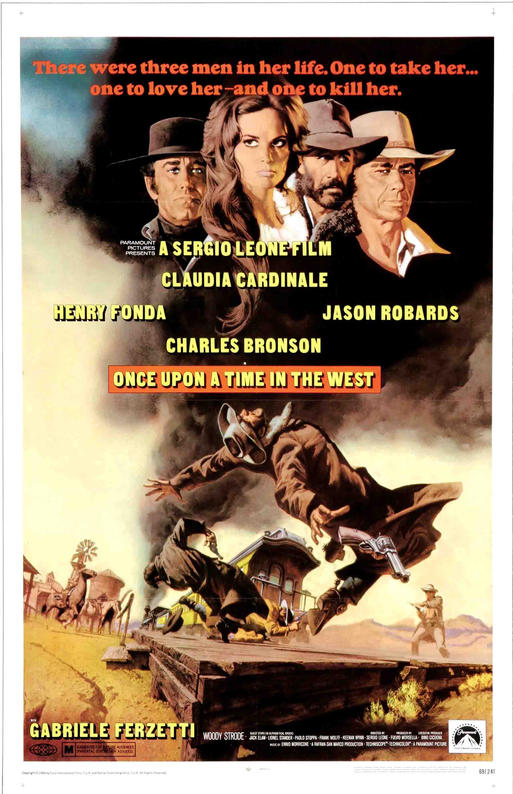 Джил Макбейн выходит замуж за фермера-вдовца и через месяц прибывает на его ферму, где узнает о том, что ее супруг и его дети были зверски убиты. Жизнь Джил оказывается в опасности, но на ее защиту встают ложно обвиненный в убийстве Шайенн и загадочный бандит по прозвищу «Гармоника», имеющий свои счеты с настоящим убийцей. «Однажды на Диком Западе» можно смело назвать последователем «Долларовой трилогии». Пусть это не прямое продолжение, но этот фильм максимально близок к ней по духу, а также является началом новой неофициальной трилогии, также включающей в себя фильмы «За пригоршню динамита» и «Однажды в Америке». Фильм идеально сочетает спагетти-вестерн и человеческую драму, что в сочетании со стилем Леоне дает сильную, напряженную и эмоциональную картину. Режиссер рассказывает нам, казалось бы, простую историю, уделяя внимание каждой детали и каждому персонажу.