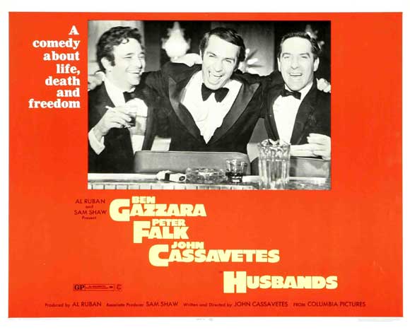 В плане безудержной экспрессии «Мужья» не уступают «Лицам»: актеры не бояться предстать в нелицеприятном виде, так чтобы их персонажи выглядели почти подонками (что особенно очевидно в сцене коллективного пения под пиво, где трио унижает пожилую женщину). Чисто вербально «Мужья» более философичны, чем «Лица», здесь герои не только развлекаются, но и рассуждают о жизни: начинаясь со сцены похорон друга, картина о времяпрепровождении троих друзей жестко ставит вопрос о кризисе среднего возраста и бессмысленности существования, ограниченного рамками тупого гедонизма. Незаметно для зрителя действие ленты перемещается в Лондон, где герои подцепляют трех женщин, с которыми обходятся по-разному (примечательно, что и здесь сцены с участием Кассаветеса наиболее выразительны не только за счет его харизмы, но и из-за удачно выбранного конфликта в гендерном дуэте). Можно сказать, что «Мужья» - столь же феминистский фильм, как и «Глория», по крайней мере, мастер не боится представить мужчин в неприятном освещении. Конечно, у зрителя могут возникнуть подозрения в том, что и в жизни Газзара, Фальк и Кассаветес такие же, как и их герои (тем более, что многие реальные факты из их жизни сохранены, так дети и жена самого Кассветеа названы своими именами и играют сами себя).
