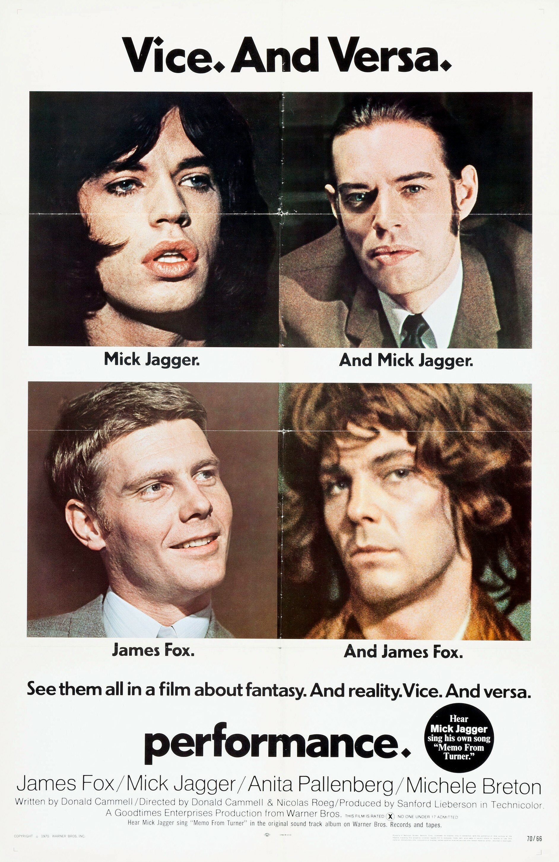 Ну, вот один из самых странных фильмов, который я видел, да и многие говорят о нём то же самое. Понять сразу с пылу с жару, о чем речь и разобраться во всех перипетиях сюжета ох как нелегко. Опять же английское кино, со всей его атмосферой и игрой. В главной роли старый мод Джеймс Фокс, играет немного психопата и в тоже время гангстера, который натворив дел, пытается смыться сначала из города, а потом и вовсе из страны. Волей судьбы он случайно попадает в логово героя Мика Джаггера, который играет рок звезду, ушедшую в забвение и катакомбы. Фильм очень психоделический, тут и много наркотиков, и фрилав, и женственный персонаж Джаггера, которого можно спутать с одной из его подружек, одним словом старый добрый «секс, наркотики и рок’н’ролл». Фильм очень странный, атмосфера, музыка, сюжет. В конце фильма шикарная песня от Джаггера. Советую потратить свое время на данную картину.