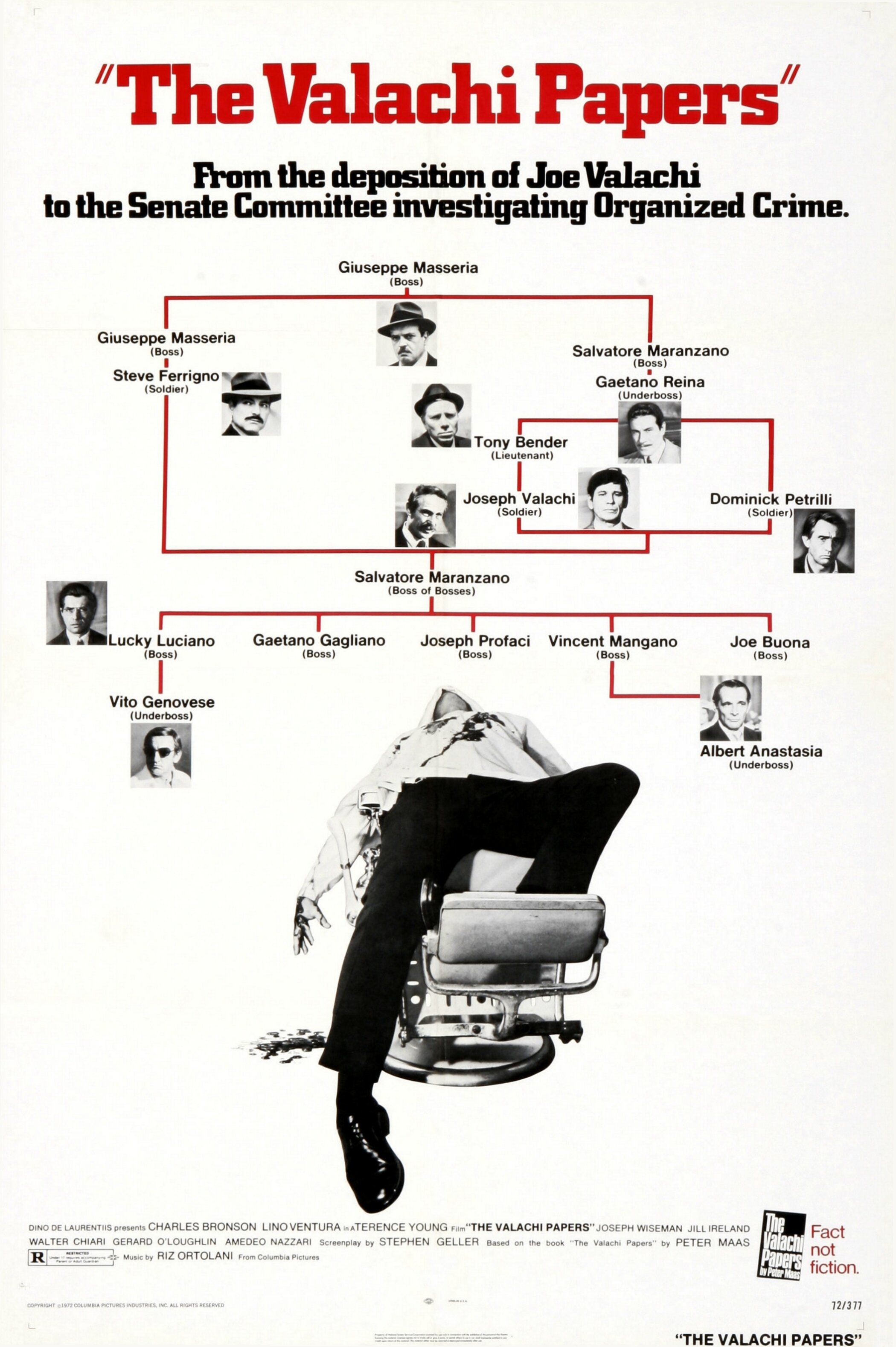 Легендарные актеры играют легендарных бандитов. Чарльз Бронсон вошел в образ Джо Валачи, первого мафиози, который в 1960-х отступил от принципа омерты и заявил: «Коза Ностра» действительно существует. Валачи выложил сначала федеральным агентам, а потом и специальной комиссии всё: историю, ритуалы, преступные схемы. И делал он это из страха перед смертью. За совершенные преступления Валачи грозила смертная казнь. А в тюрьме — смерть еще более быстрая, ведь за голову предателя босс боссов мафии Вито Дженовезе пообещал 100 000 долларов.