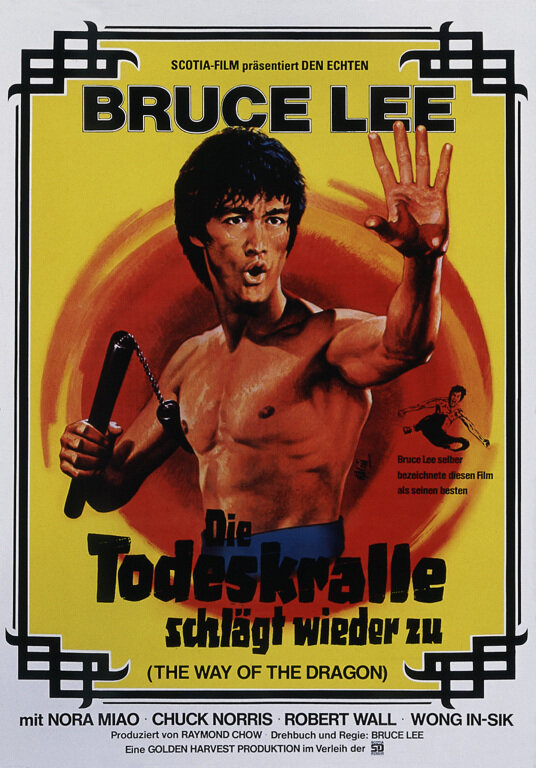 Великое противостояние Брюса Ли и Чака Норриса представляет «Путь дракона». Кроме драки о фильме мало что говорят, но на самом деле это довольно занимательный, комедийный боевик, показывающий приключения Брюса в Риме. Комедийно главный герой сталкивается с культурой и менталитетом Европы, а без знания языка картина вставляет больше локализаторских шуток.