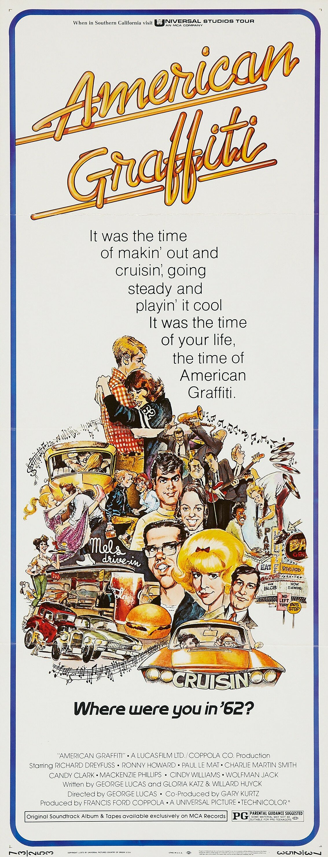 «Американские граффити» — второй фильм Джорджа Лукаса до того, как он взялся за свой самый амбициозный, прославивший его проект «Звездные войны». «Американские граффити» овеяны ностальгической дымкой, тоской по 50-м годам, эпохой редких, причудливых машин, рок-н-ролла, школьных романов. Фильм Лукаса почти целиком снят, что называется «с колес»: действие происходит в машинах, четыре героя, мечтающие перещеголять друг друга, устраивают авантюры, дабы показать себя лучше чем они есть.