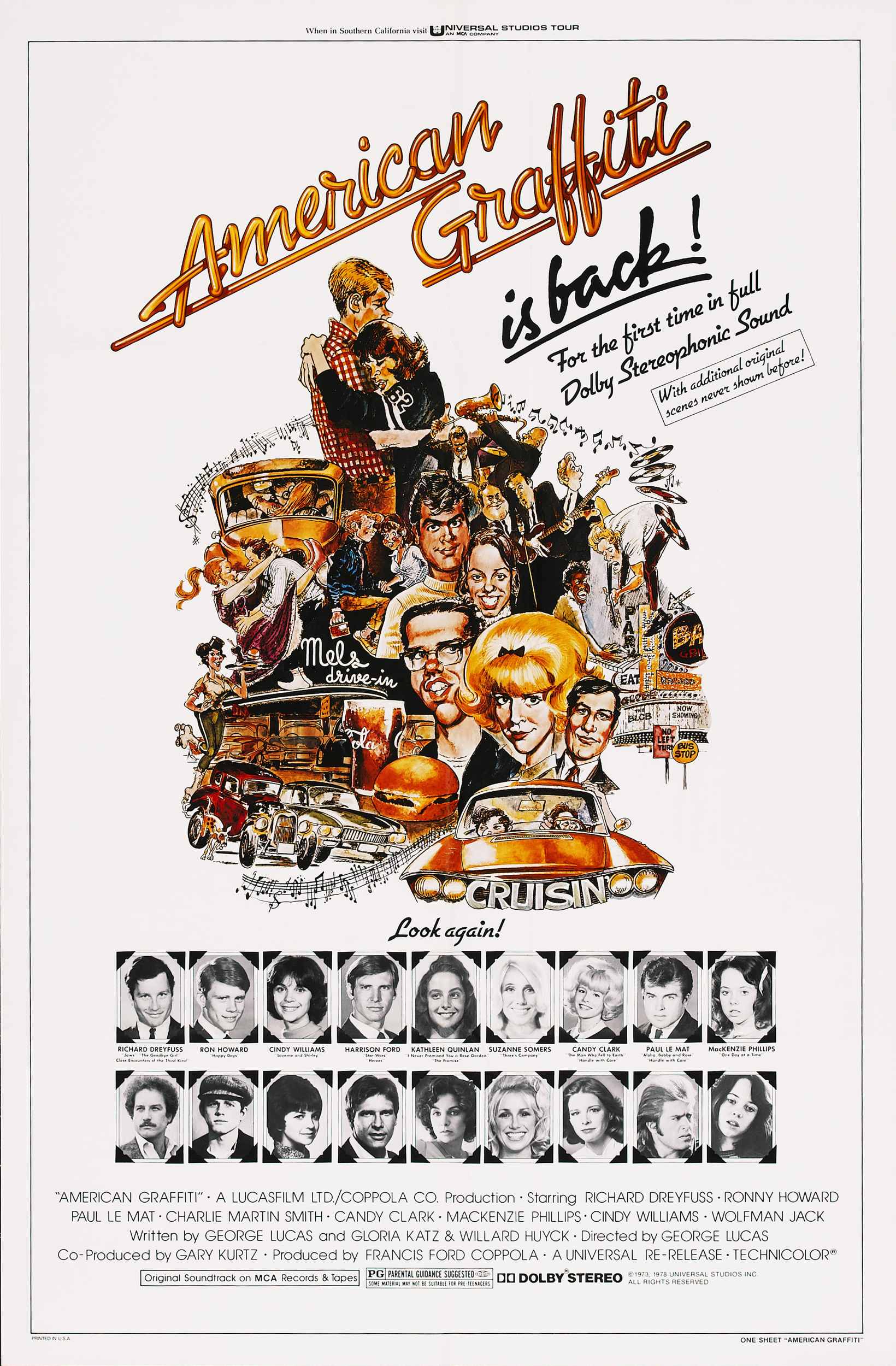 Что интересно, на роли подростков 28-летний Лукас пригласил почти что своих ровесников: в момент съёмок Полу Ле Мату было уже 26 лет, а Ричарду Дрейфусу — 25. Самым младшим тут оказался 18-летний Рон Хауард, будущий голливудский мэтр, который всего через 5 лет дебютирует в большом кино как режиссёр. На фоне центрального квартета в тени оказался Харрисон Форд — самый удачливый исполнитель 1980-х. Здесь в 30-летнем актёре ещё невозможно распознать будущую суперзвезду.