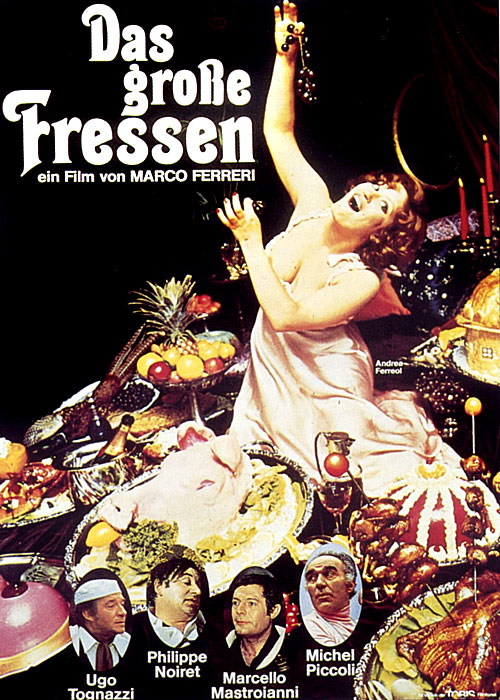 Для меня до сих пор загадка, как Феррери удавалось привлечь в свои кинохулиганства столько известных актеров и актрис (с некоторыми он дружил, это понятно, но не со всеми же). В данном случае четыре кинозвезды согласились у него сняться в довольно рискованных для их репутации и разнузданных эпизодах (что касается колоритной Андреа Ферреоль, то эта роль сделала ей имя, так что сам Фассбиндер потом пригласил ее в «Отчаяние»). В «Большой жратве» Феррери удалось почти с фрейдовским мастерством доказать взаимопереплетение Эроса и Танатоса: все плотские наслаждения умерщвляют человека, когда они чрезмерны, и уже непонятно, к чему его тянет – к жизни посредством чужой плоти или к смерти. Кроме того лента Феррери, снятая в копродукции Франции и Италии, и сейчас шокирует своим кощунственным изображением гурманства, как изощренного буржуазного извращения.