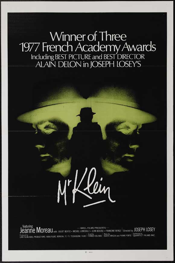 В творчестве выдающегося американо-британского режиссёра Джозефа Лоузи тема двойничества, деиндивидуализации, распада личности занимает ключевое место. Но, пожалуй, только во франко-итальянской картине «Месье Кляйн» она меняет свой вектор с отрицательного на положительный. Торговец антиквариатом Робер Кляйн во время оккупации нацистами Франции сталкивается с проблемами своего двойника, некого еврея с такими же именем и фамилией, которого преследует полиция. И для первого желание встретиться со своим однофамильцем становится наваждением.