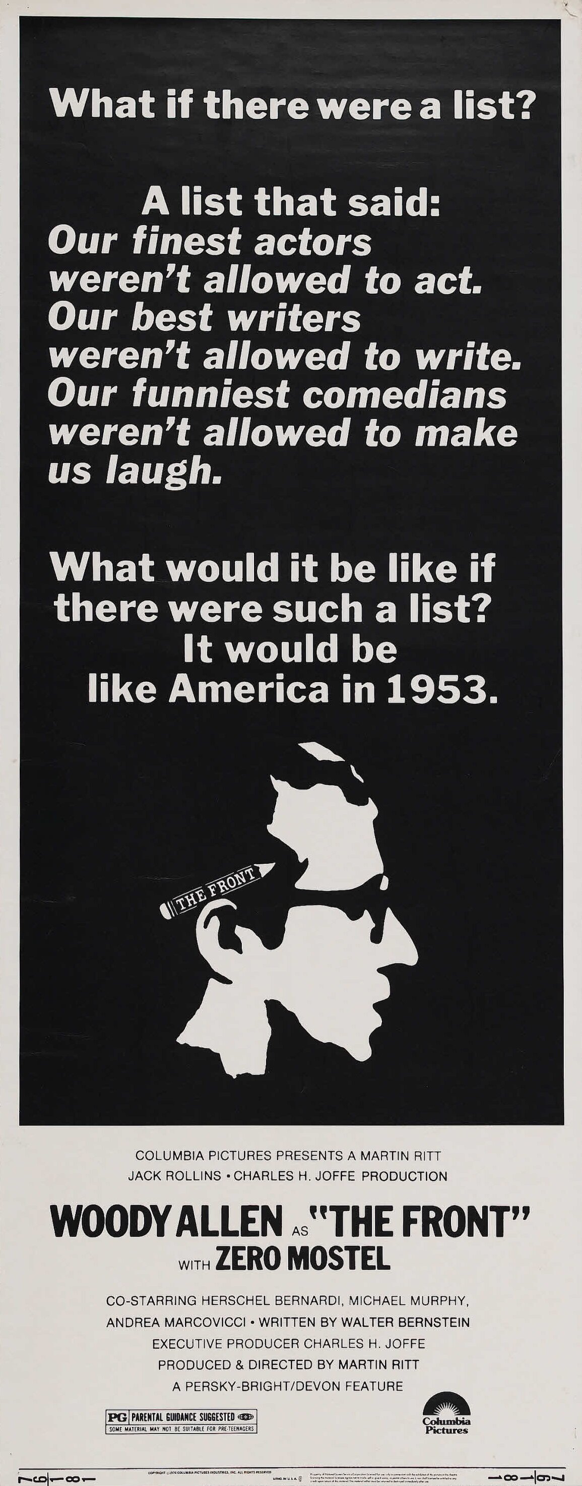 Результатом их работы стал потрясающий фильм «Фронт», названный у нас «Подставным лицом» и достаточно широко известный в СССР в качестве сатиры на американскую действительность. Правда, в СССР было в то же время немногим лучше, но тем-то и хорош фильм — он вовсе не зацикливается на проблемах американских — он поднимает проблему до всемирного «художник и человек в обществе попрания человеческих прав». Фильм сложно назвать комедией, хотя авторы смотрят на свое прошлое без злобы, но, как я уже говорил, временами сжимаются кулаки, а временами подкатывает комок.