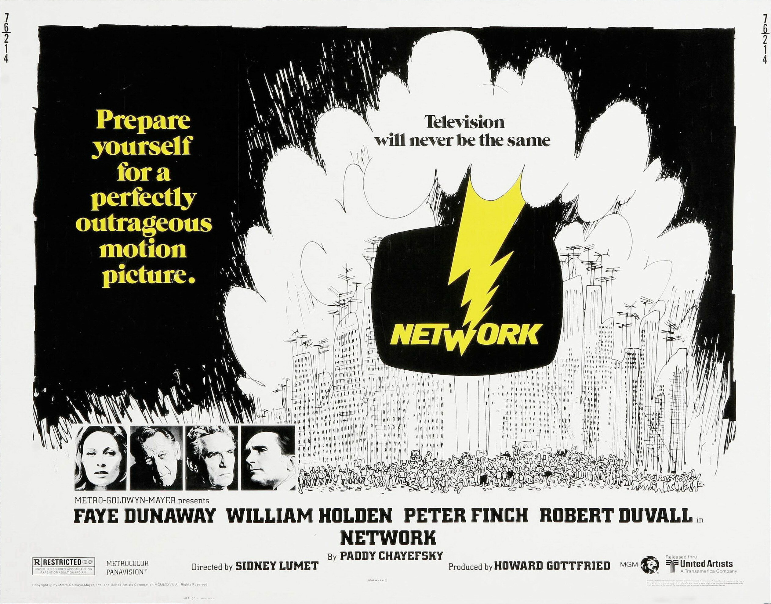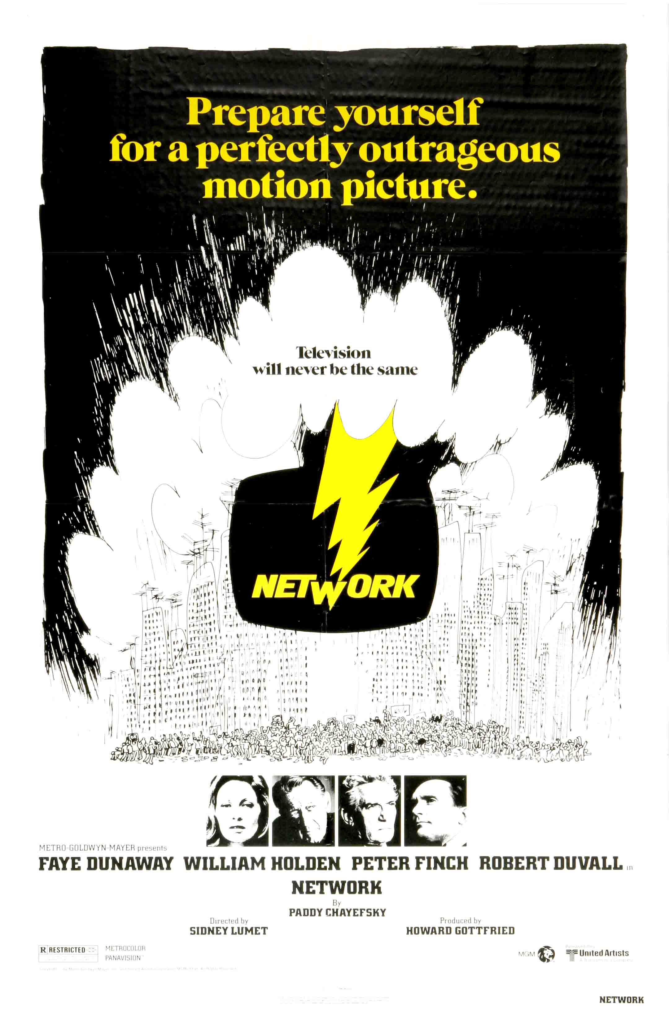 Густо-сатирический сценарий П. Чаефски поставлен режиссёром С. Люметом настолько блестяще, что фильм 1976 года кажется вышедшим буквально вчера. Во многом это и заслуга отменного по качеству актёрского ансамбля (5 номинаций — 3 «Оскара»). Не сразу заметишь, что в прогрессирующем безумии героя (П. Финч, увы, не дожил два месяца до своего награждения) слишком сильна авторская логика. Абсолютно неподражаема при этом (здравствующая и поныне) Ф. Данауэй, сыгравшая здесь свою лучшую роль. Красивая, хваткая и безжалостная корпоративная стерва — cущая всадница телемедийного апокалипсиса, приносящая на алтарь рейтинга себя и окружающих.