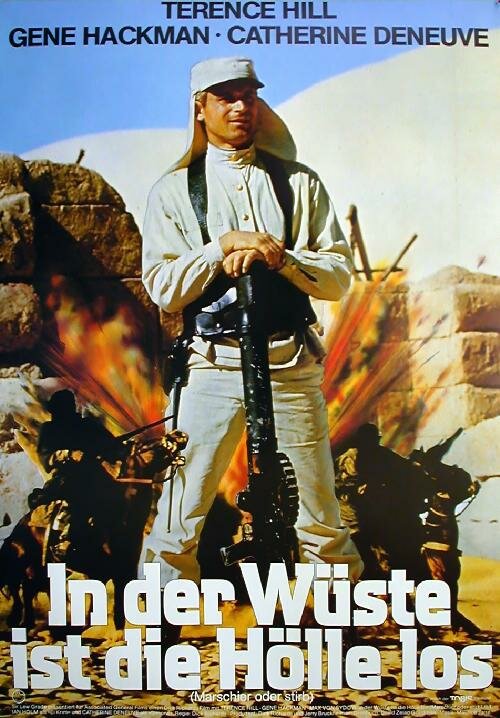 '… Если вас не убьет пустыня, то тогда вас убью я» — говорит властным голосом герой Джина Хэкмана перед строем новобранцев. Почти все слушают его внимательно, но не все герой Теренса Хилла думает про героиню Катрин Денев.