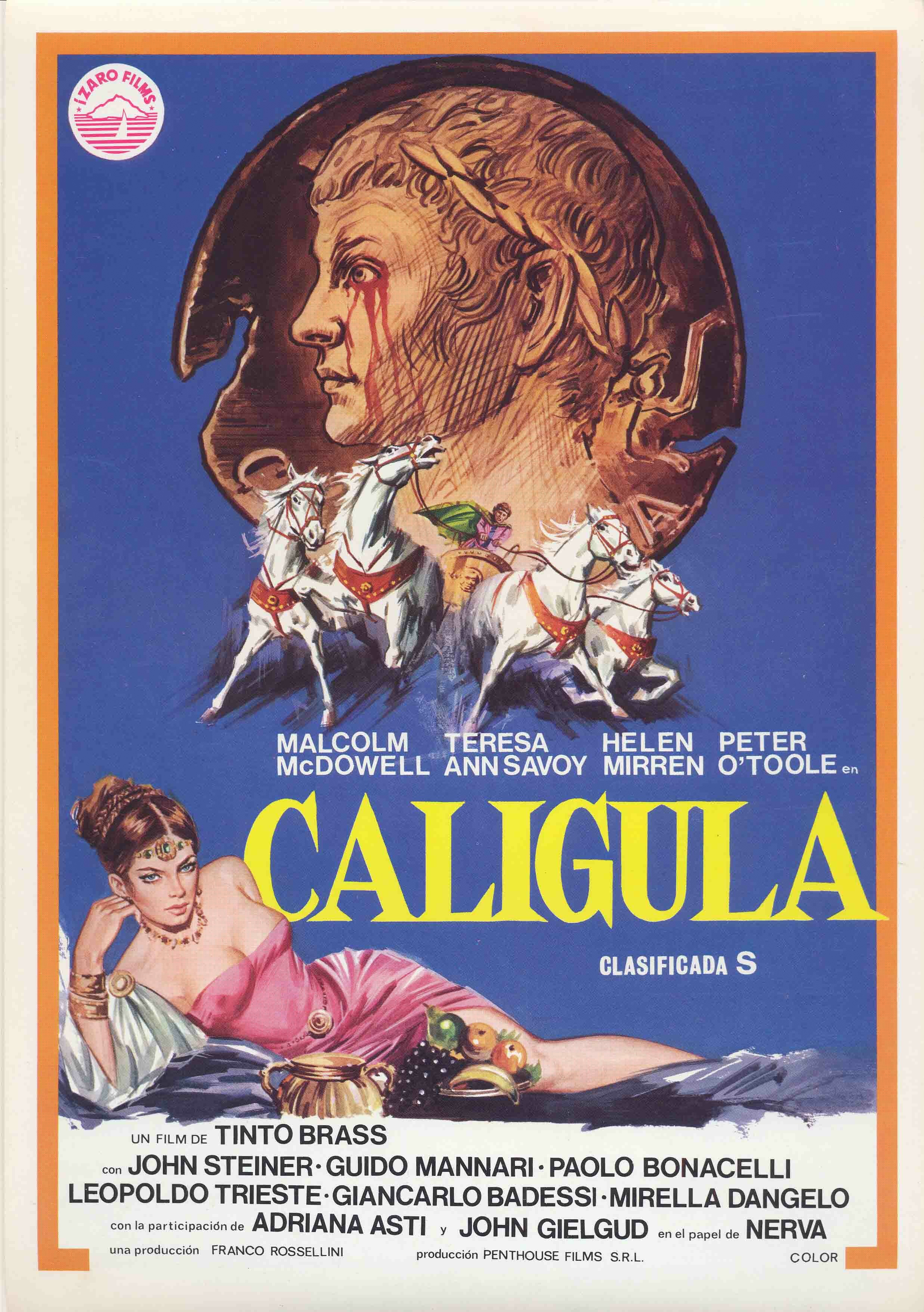 Известный мастер эротического кино Тинто Брасс («Салон Китти», «Миранда», «Паприка») сразу после неплохой исторической драмы об эпохе нацизма «Салон Китти» берётся за амбициозный и дорогостоящий проект (большой по тому времени бюджет в 17 с половиной миллионов долларов) воссоздания на экране жизни и правления самого одиозного римского императора Калигулы. Позаимствовав часть денег у боссов журнала «Пентхаус», известного своей эротической продукцией, Тинто Брасс, при помощи сорежиссёров «Пентхауса» Боба Гуччионе и Джанкарло Луи, вынужден был поневоле уделить особое внимание знаменитым оргиям Тиберия и его преемника Калигулы. Именно это и погубило этот не лишённый таланта фильм, ибо увлечение режиссёров сценами на грани явно оттенило исследование психики Калигулы и его пути к власти. Типично фрейдовские мотивы вожделения к сестре и зависти-ревности к императору Тиберию, заменившему Калигуле рано умершего отца, выражены чересчур прямолинейно, явно в расчёте на эпатаж и клубничку. Поэтому «Калигулу» вряд ли можно поставить в один ряд с другими фильмами, исследующими природу власти на примере одиозных исторических фигур («Телец» Александра Сокурова, «Гитлер: Восхождение дьявола» Кристиана Дюгуэя), хотя работа Брасса, Гуччионе и Лиу точно поинтереснее последнего фильма польского классика Ёжи Кавалеровича «Кво вадис?» об эпохе императора Нерона.