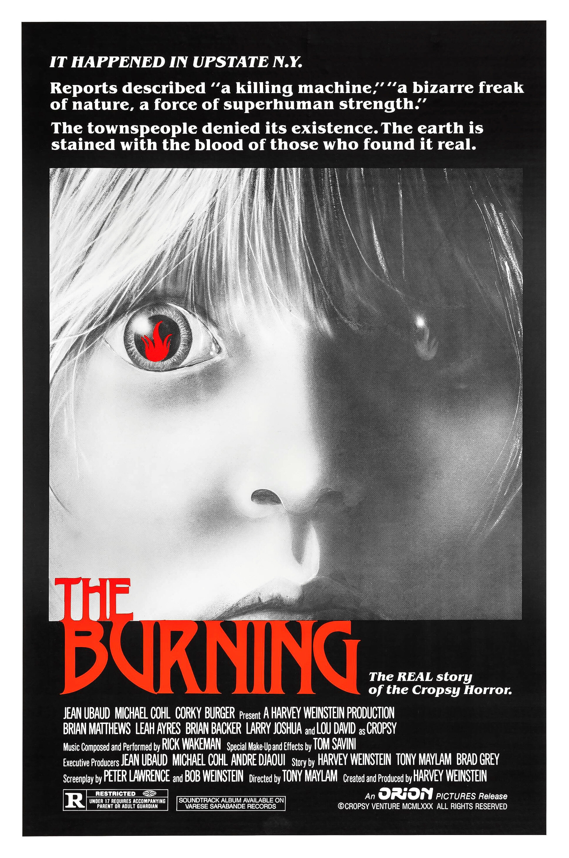 Тут убийства тоже отличны — Том Савини плохо не работает. Он в нужный момент переметнулся с конвейера, с которого собирались спускать «Пятницу, 13-е 2», и оперативно подключился к работе над «Сожжением». Умница. Без легендарной сцены на плоту (да и остальных «мясорубочных» сцен тоже) мои воспоминания об этой ленте были бы не такими светлыми. Да и грим главгада Кропси (бывшего сторожа — алкаша, случайно изуродованного подростками) тоже прекрасен.