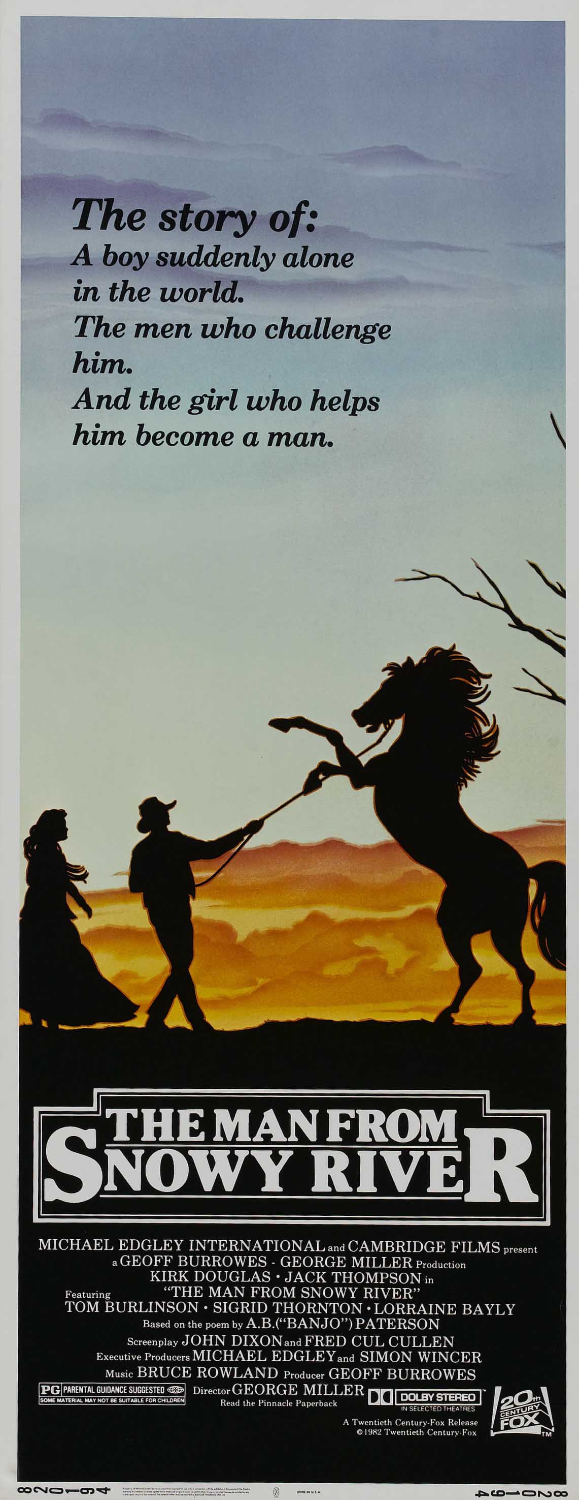 «Мужчина с Снежной реки» (1982) — это знаковый фильм австралийского кинематографа 70–80-х годов, который по праву считается культовым. В его основе лежит одноимённая поэма австралийского поэта Эндрю Бартона «Банджо» Петерсена. В центре сюжета — молодой горец-скотовод Джим Крейг, который, пережив трагическую гибель отца, устраивается на работу к жестокому землевладельцу, англичанину Харрисону. Его цель — вернуть утраченную семейную ферму и, одновременно, стать настоящим мужчиной. Работая на ранчо, Джим сталкивается с множеством испытаний и трудностей: тяжёлая работа с лошадьми, недружелюбные коллеги, невольное участие в семейном конфликте своего работодателя. В это же время он завязывает романтические отношения с дочерью Харрисона, Джессикой, которая становится его верным спутником на пути к достижению заветной цели.