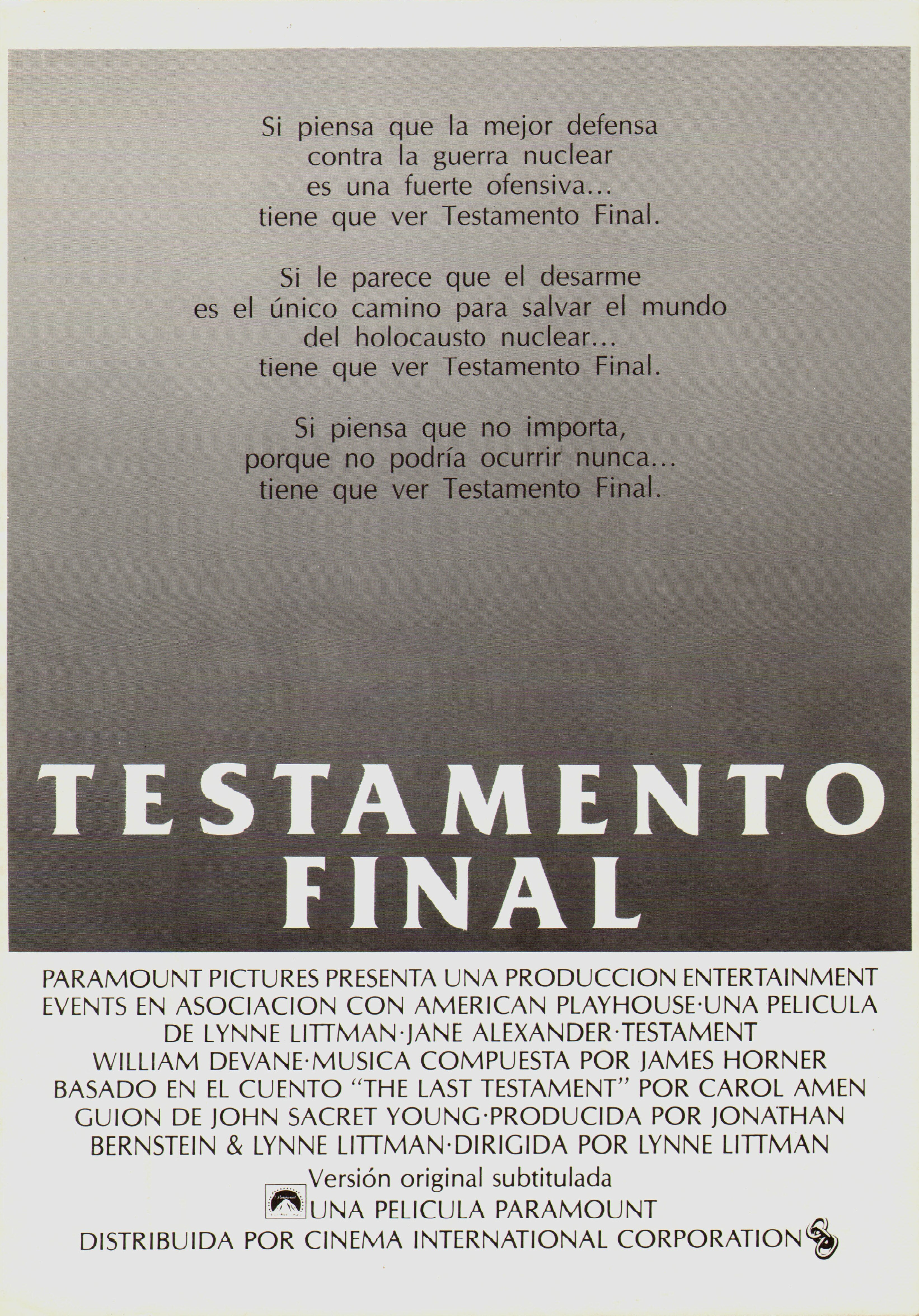 Посмотрев эту картину, изначально задумывавшуюся в рамках проекта сериал-антологии «Американский театр» службы телевещания PBS, легендарный критик Роджер Эберт поставил ей аж 4 звезды и написал, что смотрел фильм два раза и каждый раз при этом плакал. Наверное, атмосфера холодной войны пополам с известной любовью штатовских зрителей к теме семейных ценностей сыграла свою роль в начале 1980-х, но «Завещание» не только не растрогало, более того, оставило ощущение крайнего недоумения ввиду откровенно наивного сценария и сухой, телевизионной манеры режиссуры Линн Литман, удостоенной в свое время «Оскара» за лучшую документальную короткометражку («Сочти наши дни»).