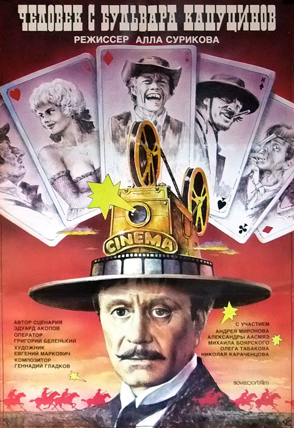 В-третьих, постановка. Ставила фильм небезызвестная Алла Сурикова. Лично она мне запомнилась этим фильмом и «Чокнутые» (1991). Были и другие хорошие фильмы в её карьере, но все пришлись до развала СССР, дальше у неё не задалось как и у всего российского кинематографа. Но «Человек с бульвара Капуцинов» она поставила идеально, конечно, не без киноляпов, но качественно. Думаю, настоящая атмосфера Дикого Запада — это, во многом, её заслуга.