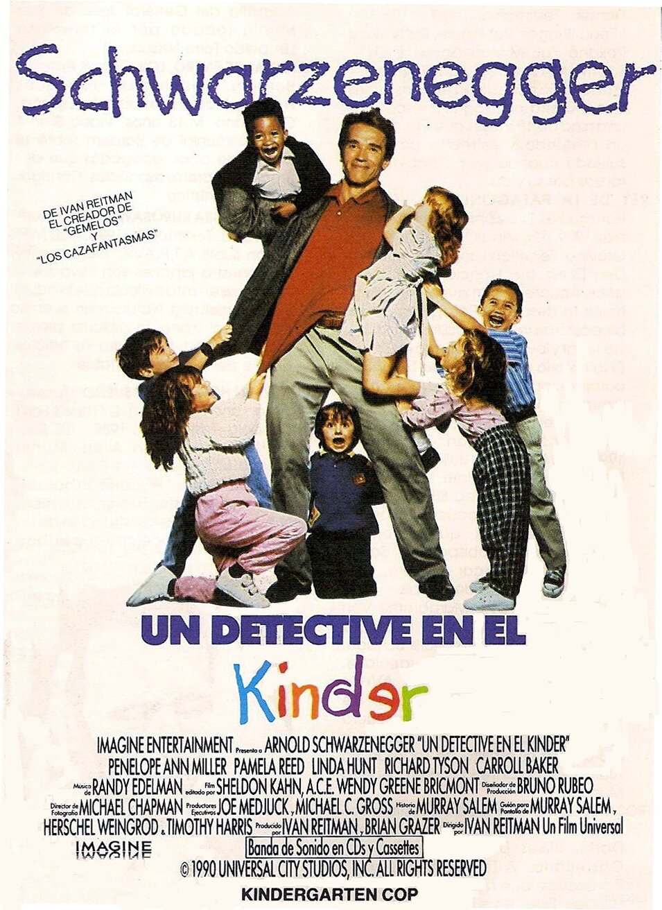 Рейтман — талантливейший режиссер-комедиограф, один из самых успешных во второй половине 20-го века. И он не чужд работе с детьми. Еще в 1979 он сделал циничного и расхлябанного Билла Мюррея вожатым у группы неуправляемых и помешенных на вопросах полового созревания детишек в легендарных «Фрикадельках». Потом в «Охотниках за привидениями 2» для придания фантастическому сюжету семейной окраски и сентиментальной направленности тому же Биллу Мюррею вручил в руки малыша Оскара, которого он вынужден был со своими друзьями спасать от злобного призрака. Нетрудно догадаться, что и роль несдержанного копа в «Детсадовском полицейском» он готовил для Мюррея, который по его идее, должен был сразу же с площадки вторых «Охотников» шагнуть на площадку «Детсадовского». Однако Мюррей уже собирался приступить к работе над своей первой самостоятельной картиной «Быстрые перемены», в которой не только играл главную роль, но и занимал режиссерское кресло и уже подписал контракт на главную роль в картине «А как же Боб?» Фрэнка Оза.