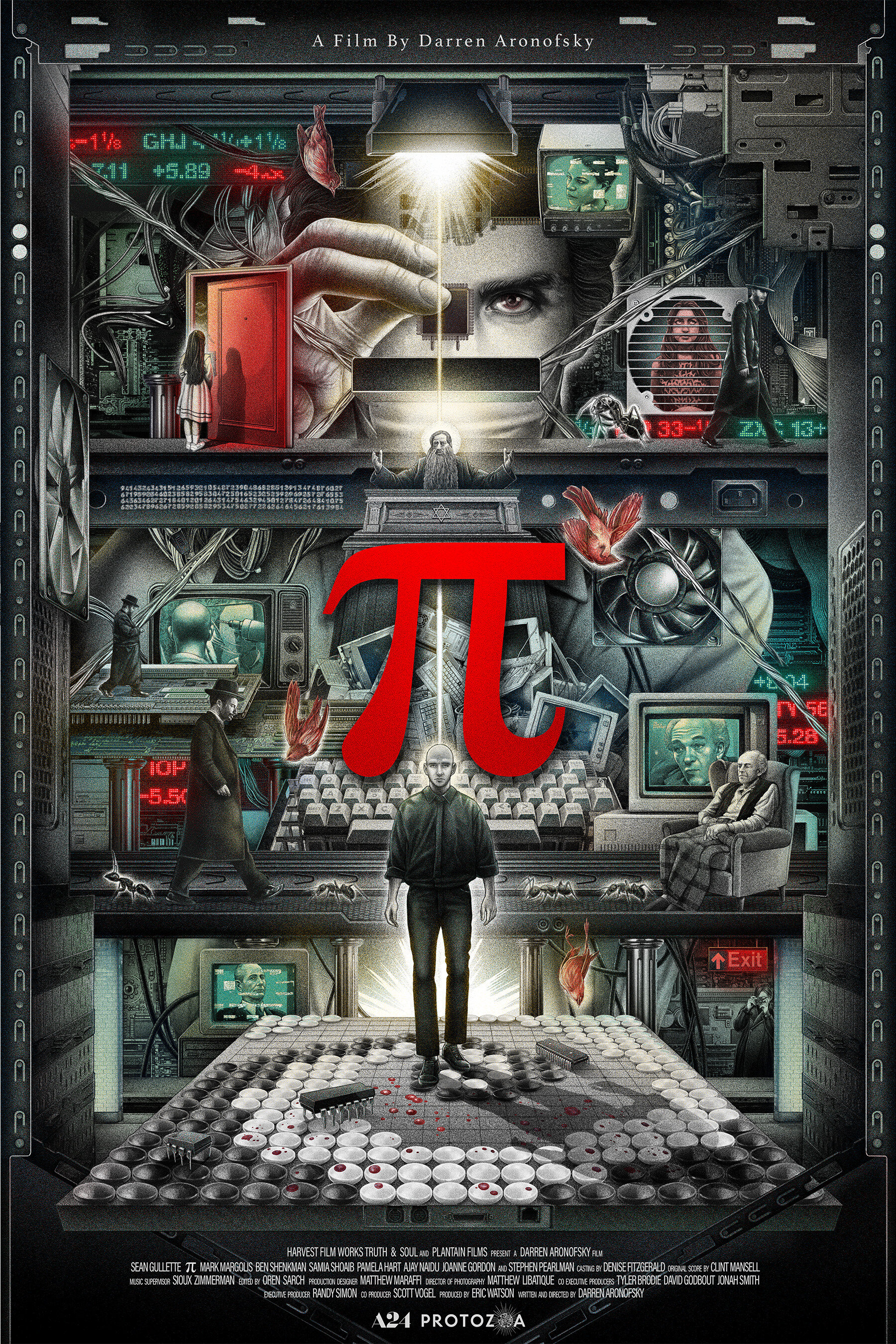 Полнометражный дебют Даррена Аронофски, к работам которого у критиков всегда было противоречивое отношение (одни восхищались тем, как легко режиссер делает доступным авторское кино для масс, а вторые, напротив, поливали грязью за попсовость и примитивную подачу «в лоб»), всерьез заслуживает уважения. Ведь этот атмосферный сюрреалистический триллер, снятый за какие-то 60 тысяч долларов, был, во-первых, снят на карманные деньги и то, чем «скинулись» друзья и родственники режиссера, а во-вторых исподтишка без официального разрешения на съемку. Параноидальная и свинцовая атмосфера фильма, эффект чего также был усилен съемкой на дешевую черно-белую камеру, отчетливо напоминает ту, что была в сюрреалистической притче «Голова-ластик» (1977) Дэвида Линча, так же весьма стесненного в средствах на съемку в свое время. «Пи», конечно же, не имеет абсолютно ничего общего с ранними короткометражными проектами Аронофски, в том числе, и откровенно дурацкой «Нет времени» (1994), и именно здесь режиссер окончательно утвердит свой выбор темы, на которую снимет дальнейшие общеизвестные работы — человеческая одержимость. Математик Макс Коэн, отлично сыгранный Шоном Гуллетом (к сожалению, карьера актера после этого по каким-то причинам не задалась) становится жертвой навязчивой идеи докопаться до истины, скрытой в легендарном иррациональном числе пи, где число знаков после запятой устремляется в бесконечность. Все происходящее с ним постепенно теряет связь с реальностью и напоминает кошмарный сон, где постижение непостижимого через мир чисел, в конечном счете, приводит к апокалиптическим последствиям, вследствие чего сам фильм можно рассматривать, как притчу о невозможности постичь суть мироздания, смысл жизни в целом.