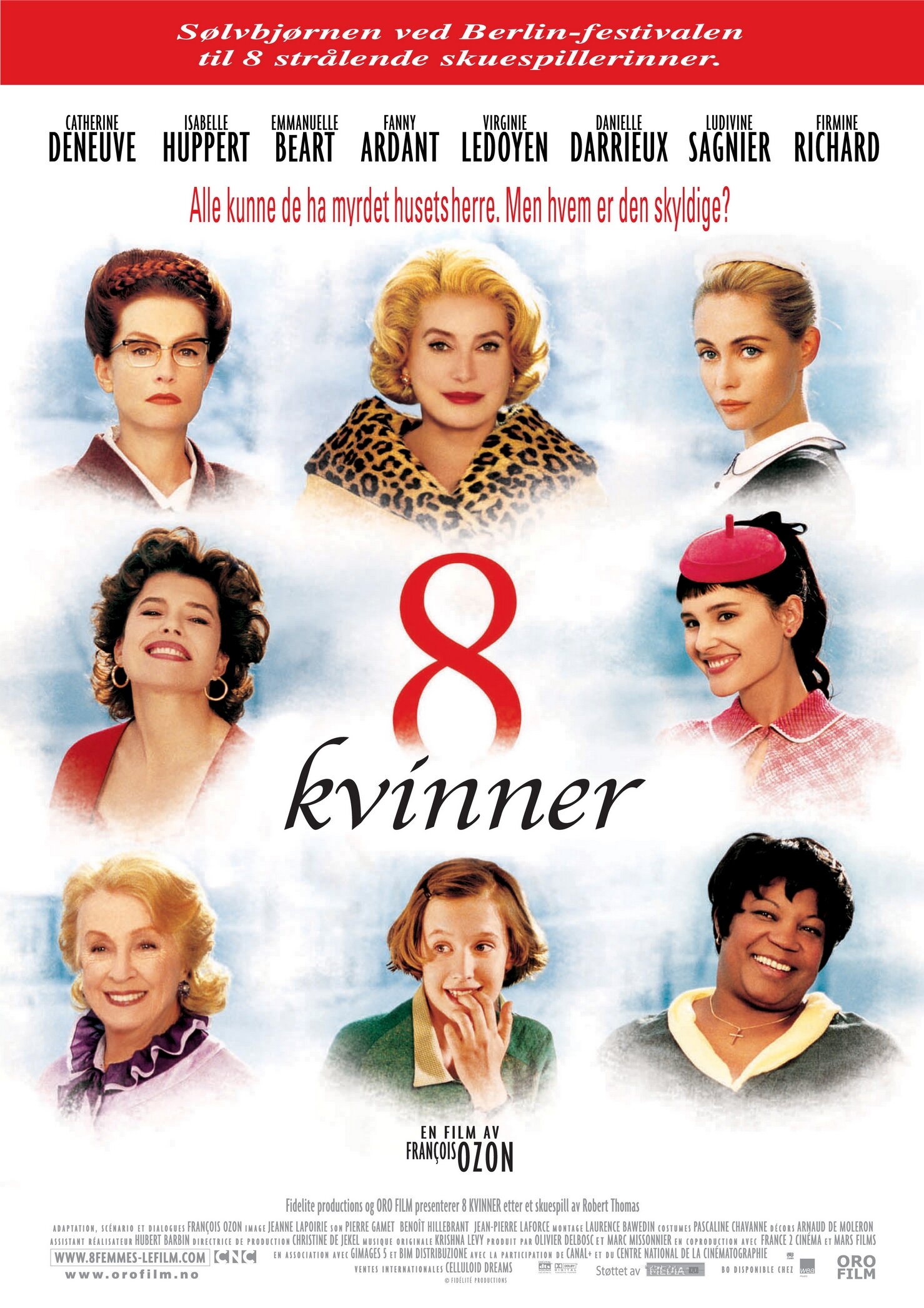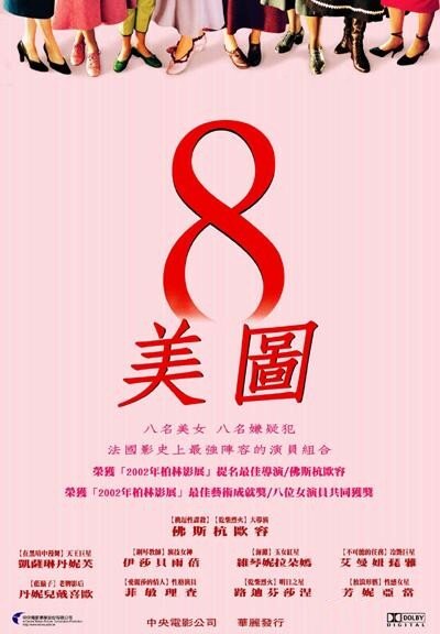 «8 женщин» — это смесь из ретро мюзикла и классического детектива в духе Агаты Кристи с элементами черного юмора. Действие фильма разворачивается в канун Рождества, но праздник омрачен страшной вестью — убит хозяин дома. Ясно только то, что преступление могла совершить одна из присутствующих в доме дам. Но как искать убийцу, если у каждой был свой мотив для убийства и свой маленький секрет? Франсуа Озон приготовил потрясающее сочетание из увлекательного сюжета, ярких образов в стиле 50-ых годов, феноменальной актерской игры настоящих див французского кинематографа, музыкальных номеров и оригинальной развязки в лучших традициях детективного жанра.