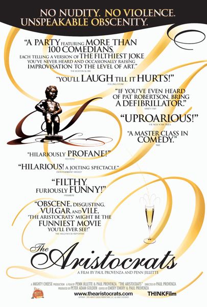 Итак, что это за шутка — «Приходит человек в агентство талантов, просит выступить, затем показывает сверх грязный и пошлый номер, с кучей вульгарных действий. После окончания номера, агент спрашивает — «И как это называется?»- «Аристократы!» И дело здесь в том, что середина шутки свободна, и там можно поэкспериментировать…