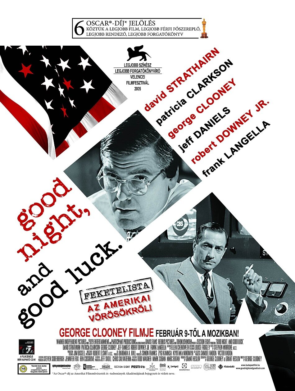 Как режиссера Клуни преимущественно интересует, что в тот период происходило за кулисами CBS. А там, в сероватых телестудиях и кабинетах, кипела работа! Мужчины (и несколько женщин) в строгих костюмах вели друг с другом оживленные споры. Все беспрестанно и помногу курили. Коллективом просматривали и обсуждали отснятый материал. Скрупулезно продумывали информационное наполнение передач. Покуда в соседней студии выступала живьем исполнительница джаза (Дайян Ривз), поддерживавшая общую атмосферу свободы и творчества. Еще больший шарм всему увиденному придает лоснящийся черно-белый визуал и деликатное обращение с камерой оператора-корифея Роберта Элсвита. Похоже, решение сделать фильм черно-белым — неслучайное. Во-первых, сразу указание на то, что показываемые события имели место в прошлом. Во-вторых, проявление ностальгической романтики по невозвратным временам. В-третьих, это, конечно, стилизация: с одной стороны, под телекартинку 1950-х, а с другой — под чисто кинематографическую эстетику неонуара. На экране, меж тем, светятся знакомые лица. Так, Клуни расхаживает в образе продюсера и друга главного героя — Фреда Френдли. Джефф Дэниелс эпизодически мелькает в роли начальника отдела новостей Сига Микельсона. Роберт Дауни-младший и Патришия Кларксон изображают влюбленных супругов Джо и Ширли Вершба, вынужденных держать в тайне свой брак от коллег-репортеров. В главной же роли предстал актер Дэвид Стрэтэйрн, который столь мастерски перенял интонацию голоса и манерность известного телеведущего, а также его фирменное прощание со зрителями — «Доброй ночи и удачи!» — что невольно может почудиться, будто перед нами настоящий Эдвард Мюрроу!