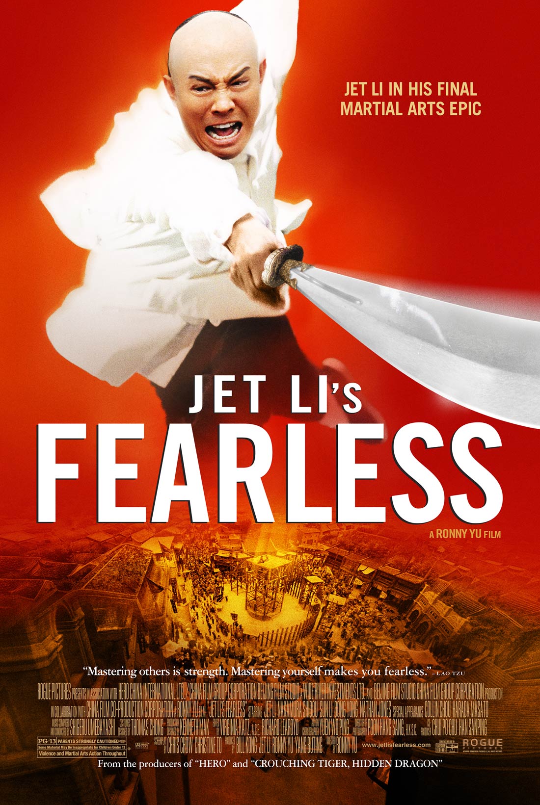 В общем… надо смотреть! Творчество таких легенд как Брюс Ли и Джеки Чан получило достойное пополнение. И если были кое-какие сомнения насчет принадлежности Джета Ли к разряду Лучших из Лучших в свете его не самых удачных работ в Голливуде, однако «Бесстрашный» с первых минут развеет эти сомнения в пух и перья. Подобно тем, что вылетали из незадачливых противников ХуаЯньЦзя, посмевших усомниться в могуществе его духа и крутости тела.