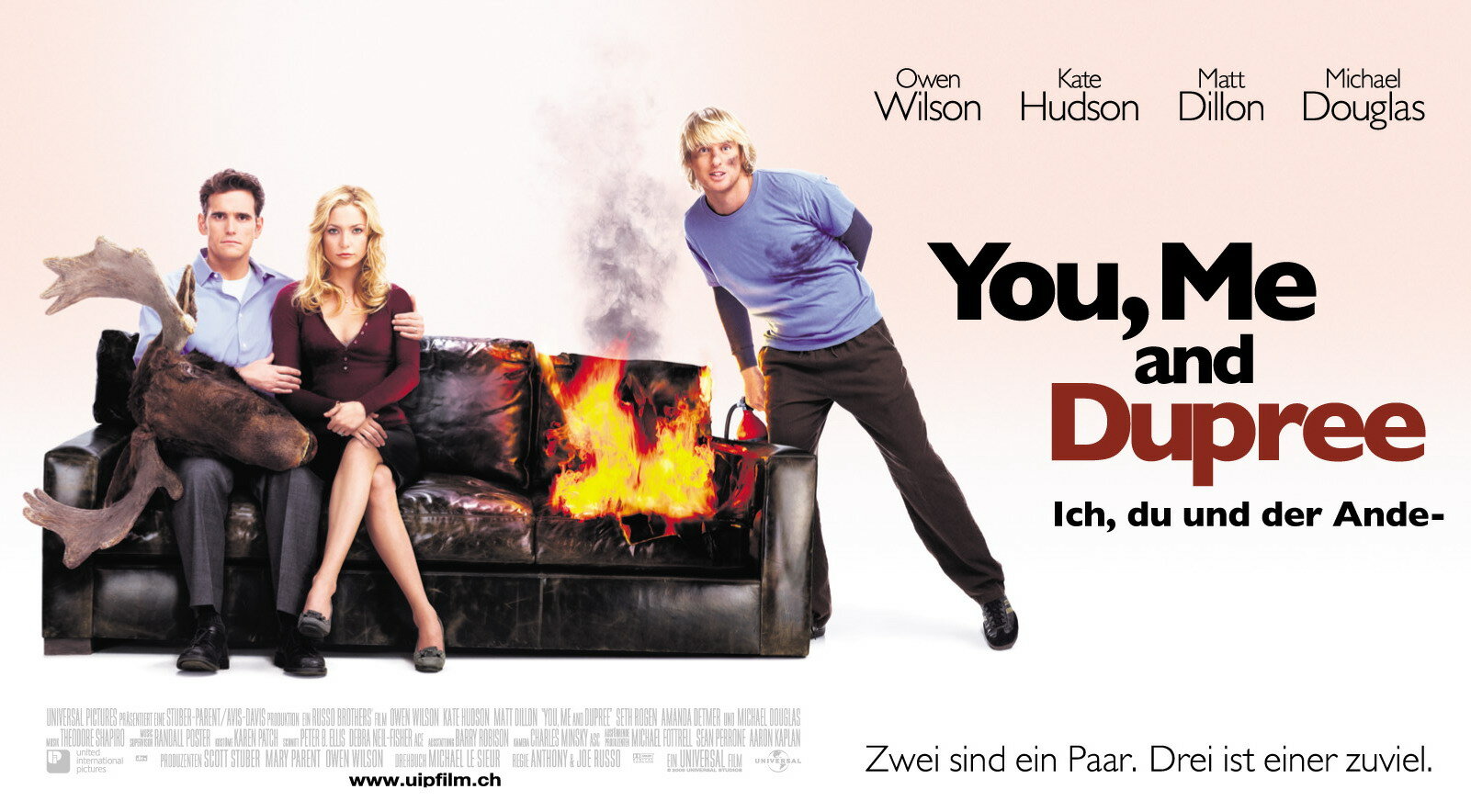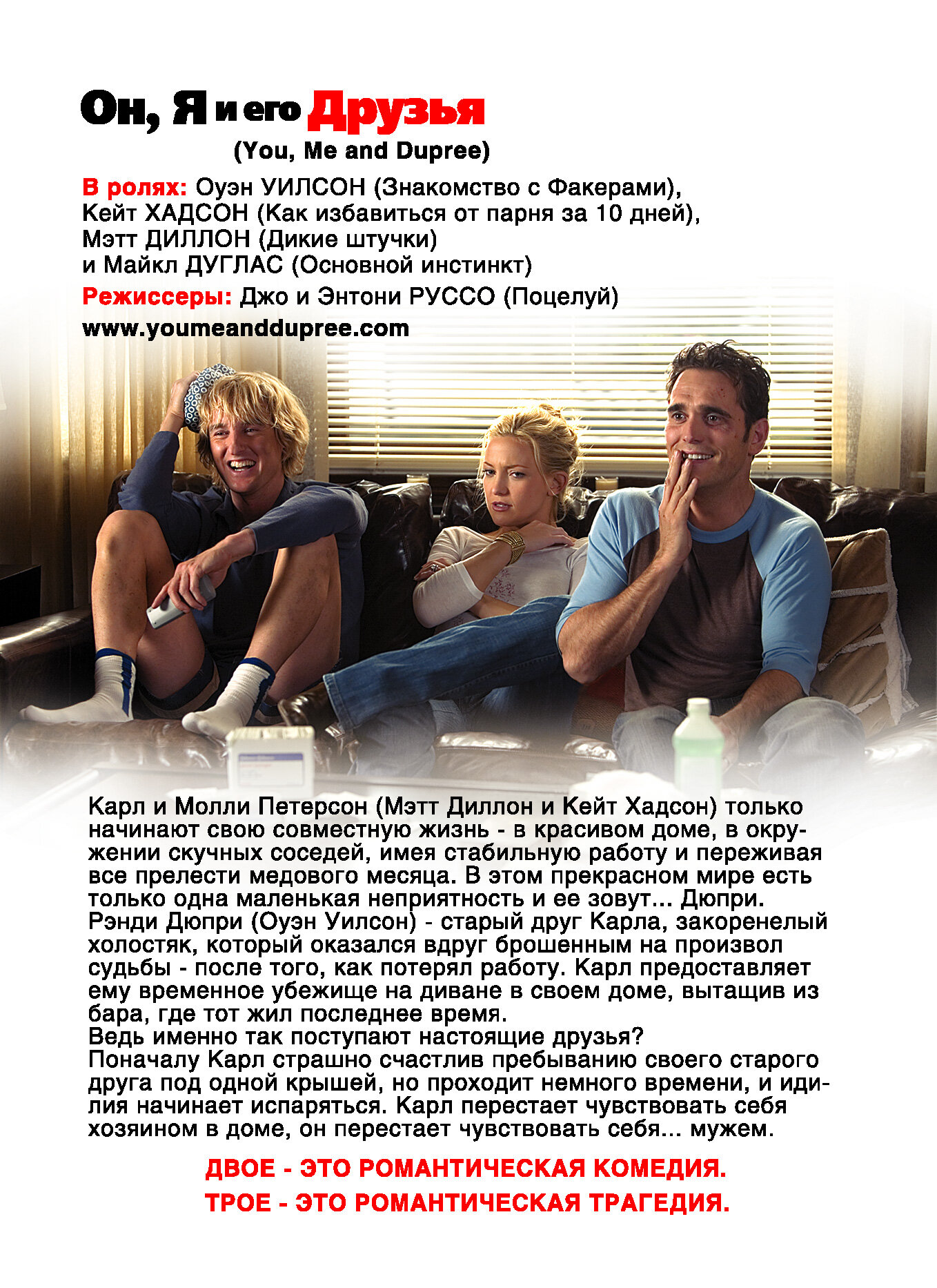Не знаю, чем руководствовались наши переводчики, когда решили, что оригинальное название фильма «Ты, я и Дюпри» перевели как «Он, я и его друзья». Несогласие состоит только в заключительном словосочетании»… и его друзья», так как именно Дюпри, герой Оуэна Уилсона в фильме, составляет основной груз сюжетного толка, то есть ли бы не он, то замечательно жила бы семья Карла (Мэтт Диллон) и Молли (Кэйт Хадсон), но Дюпри навёл хаос не только в их доме, но и в личных отношениях, от которых пострадал по-своему даже узурпатор мистер Томпсон (Майкл Дуглас), отец Молли и по совместительству непосредственный начальник Карла. А вот»… и его друзья», имеются в виду Карла, вероятно, появятся в более-менее крупных сценах лишь пару раз, а вот Дюпри будет постоянно мельтешить на экране. Или же имели ввиду Карла, Дюпри и его друзей, но сути не поменяет, потому что друзья у Карла и Дюпри одни и те же.