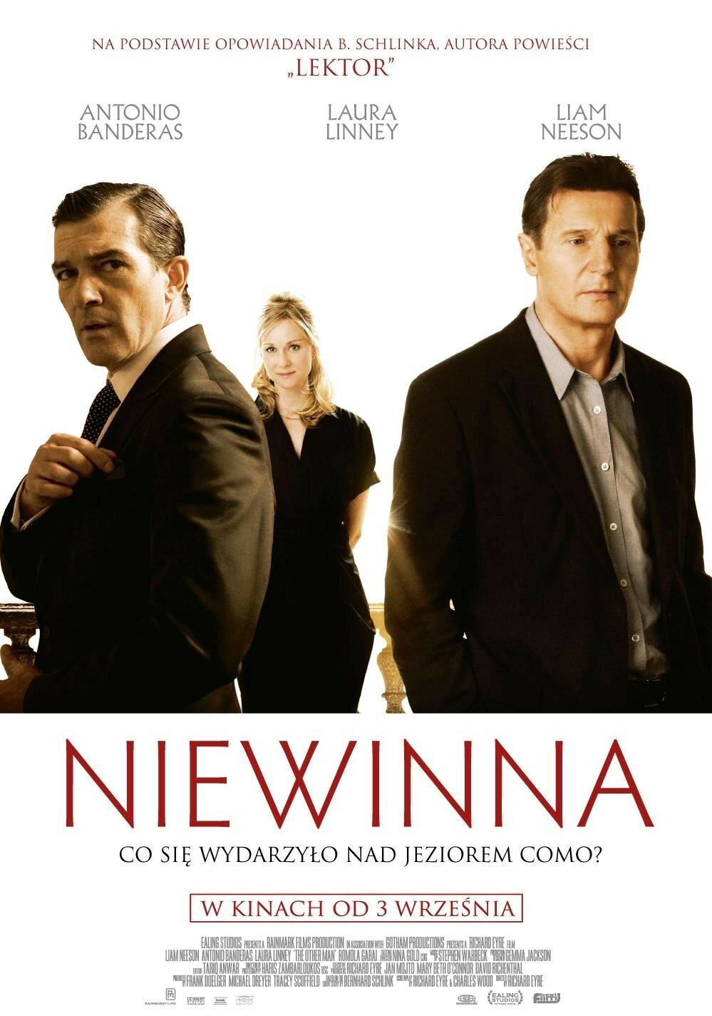 Но вот, чтобы хотелось отметить: в выше перечисленных фильмах Эйр вплотную работал по большей части с актрисами. Ему повезло сотрудничать с Кэйт Уинслет, Джуди Денч, Клэйр Дэйнс и Кэйт Бланшетт — согласитесь, что эти имена говорят сами за себя, а авторитет данных актрис в кинематографическом мире непререкаем. Но в «Другом мужчине» Ричарду Эйру выпала возможность работать уже с представителями мужской актёрской когорты, и имена их тоже известны многим зрителям, если не всем. Главные роли в «Другом мужчине» исполнили Лиам Нисон и Антонио Бандерас. Конечно, не обошлось без женщин — для участия были приглашены Лора Линни и Ромола Гарай. И сюжет, основанный на рассказе Бернхарда Шлинка (по его же роману в том же 2008-ом году на экраны вышла драма «Чтец», столь хвалебно принятая критиками), строится вокруг героини Лоры Линни, но её персонаж выступает больше как «МакГаффин».