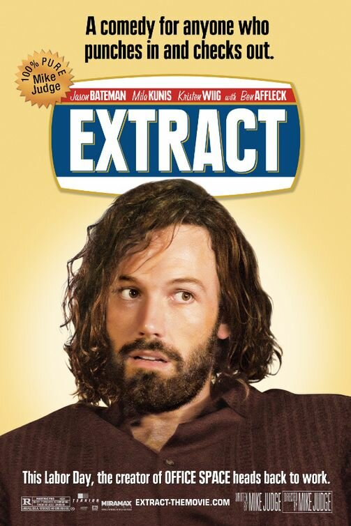 Джоэла играет Джейсон Бейтман, замеченный мной относительно недавно — в фильме «Старски и Хатч» и с тех пор изрядно преуспел в создании самых разных по профессии и характеру образов. Появлялся он и в «Лавке Чудес», и в «Джуно», и в «Хэнкоке», и много где ещё. Незамеченным не остался практически нигде. Но в «Экстракте» внимание зрителя с него как-то само по себе перетекает не на Милу Кунис (мелкая воровка, наживающаяся на возврате покупок, слезах и красоте, как и в «Максе Пэйне» её дарование не впечатляет вообще), а на Бена Аффлека, давно подрабатывающего на студии Miramax. Здесь Бен выглядит так, словно его вернули с острова (необитаемого), где он стосковался по общению — отсюда его жаркие речи, подкреплённые жестикуляцией.