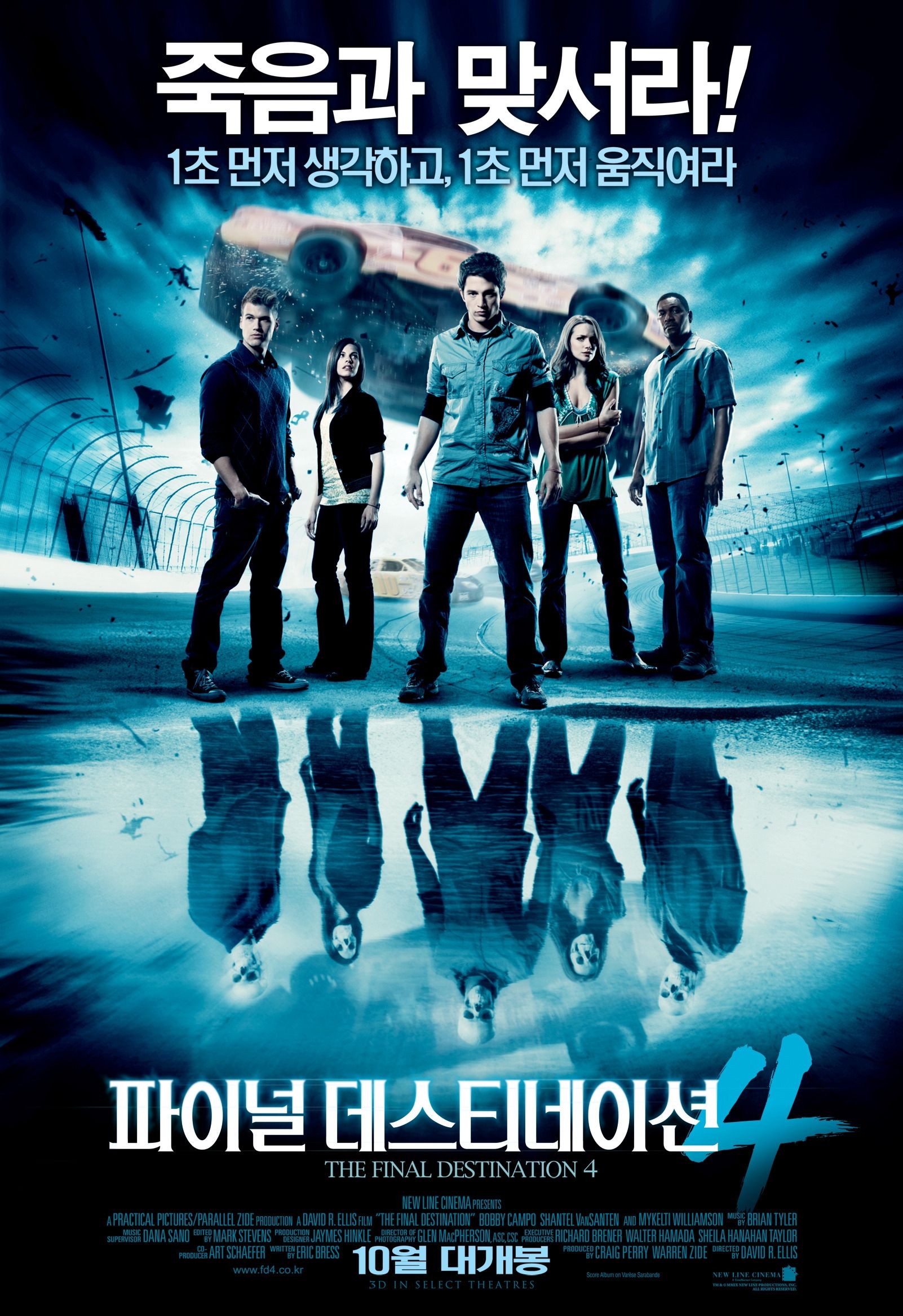 Что же может предложить нам четвертая часть? Да по сути все то же самое, только в 3D. После самолета, автомобиля и американских горок перед создателями стоял вопрос – где провернуть катастрофу на этот раз. Можно было бы снять тонущий корабль, но Джеймс Кэмерон уже сделал это в 1997. Решение было не самым очевидным – большая авария во время гонок на автодроме. Здесь нужно сделать небольшое отступление – в США крайне популярны гонки по овальной трассе по типу Наскара (извилистые трассы в духе Формулы-1 всегда были гораздо менее почитаемы, хотя в последнее время Королевский Цирк снова пытается выйти на американский рынок), поэтому в принципе для американской аудитории авария на условном Наскаре смотрелась вполне логично. Ну а дальше все по отработанной схеме – видение у одного из зрителей, несколько выживших, которые вдруг тоже начинают погибать. Короче говоря, то же самое в четвертый раз.