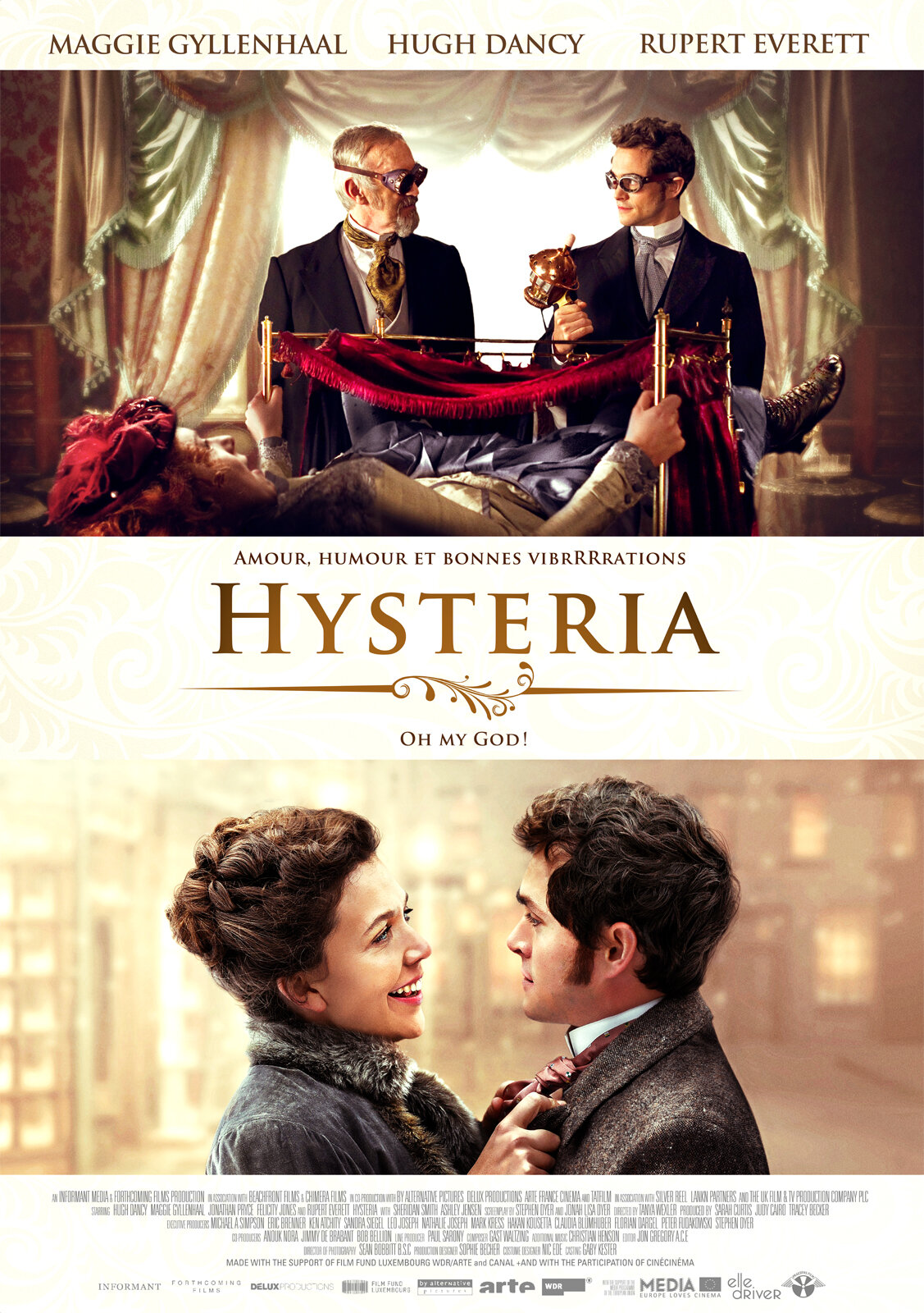 И пока постоянно смущающийся молодой медик со смешными бакенбардами (Хью Дэнси) помогает профессору (Джонатан Прайс) лечить приступы «истерии» мануальной терапией, одна дочь профессора читает романы, играет на пианино и живёт ради свадьбы, другая (Мэгги Джиленхалл) носится по Лондону на велосипеде, работает в школе для бедных детей и верит в микробы. Истеричкой называют вторую, но заподозрить стоит первую (увы, оснований создатели не подкинули). Итог несмелых чувств доктора к девушкам ясен любому достаточно опытному кино-зрителю, а финал смело расставляет точки над i, объясняя что же такое «истерия» на самом деле и кому эта болезнь нужна. Кино, которое многие могли бы назвать женским предназначено мужской аудитории, и, как показывают отзывы ей оценено достойно.