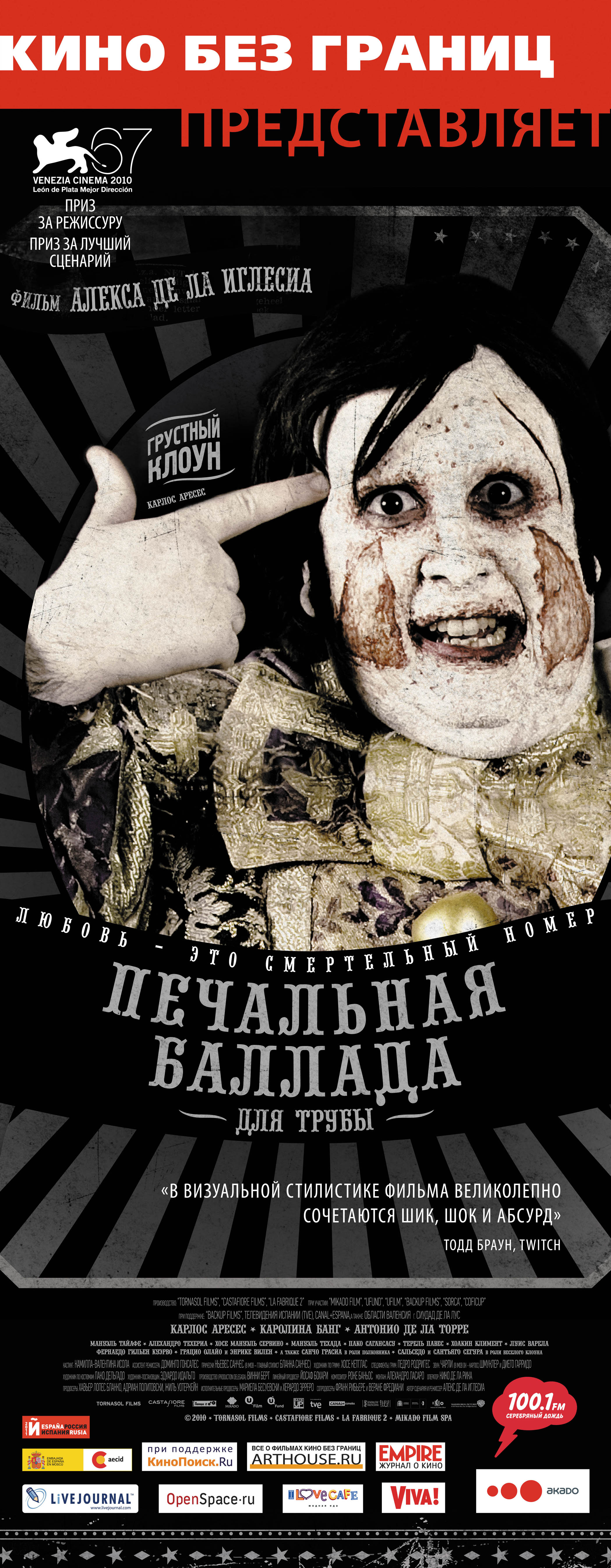 «Печальная баллада для трубы» — довольно интересное испанское кино, которое, по моему мнению, немного страдает от некоторой творческой расхлябанности режиссёра и сценариста фильма Алекса де ла Иглесия. Начинается картина в лучших традициях «Бесславных ублюдков» Тарантино — рыжий клоун убивающий немцев, используя мачете — шикарный глум и картинка. Затем, практически половину хронометража фильма на экране главенствует драматичная история о достаточно банальном любовном треугольнике — она любит мерзавца, мерзавец её бьёт, но она никак не может уйти от него и принять любовь толстенького, доброго и наивного Хавьера. Ну а, в конце, неожиданно начинается форменный кровавый трешак и сюр — зрелище, мягко говоря, не для слабонервных.
