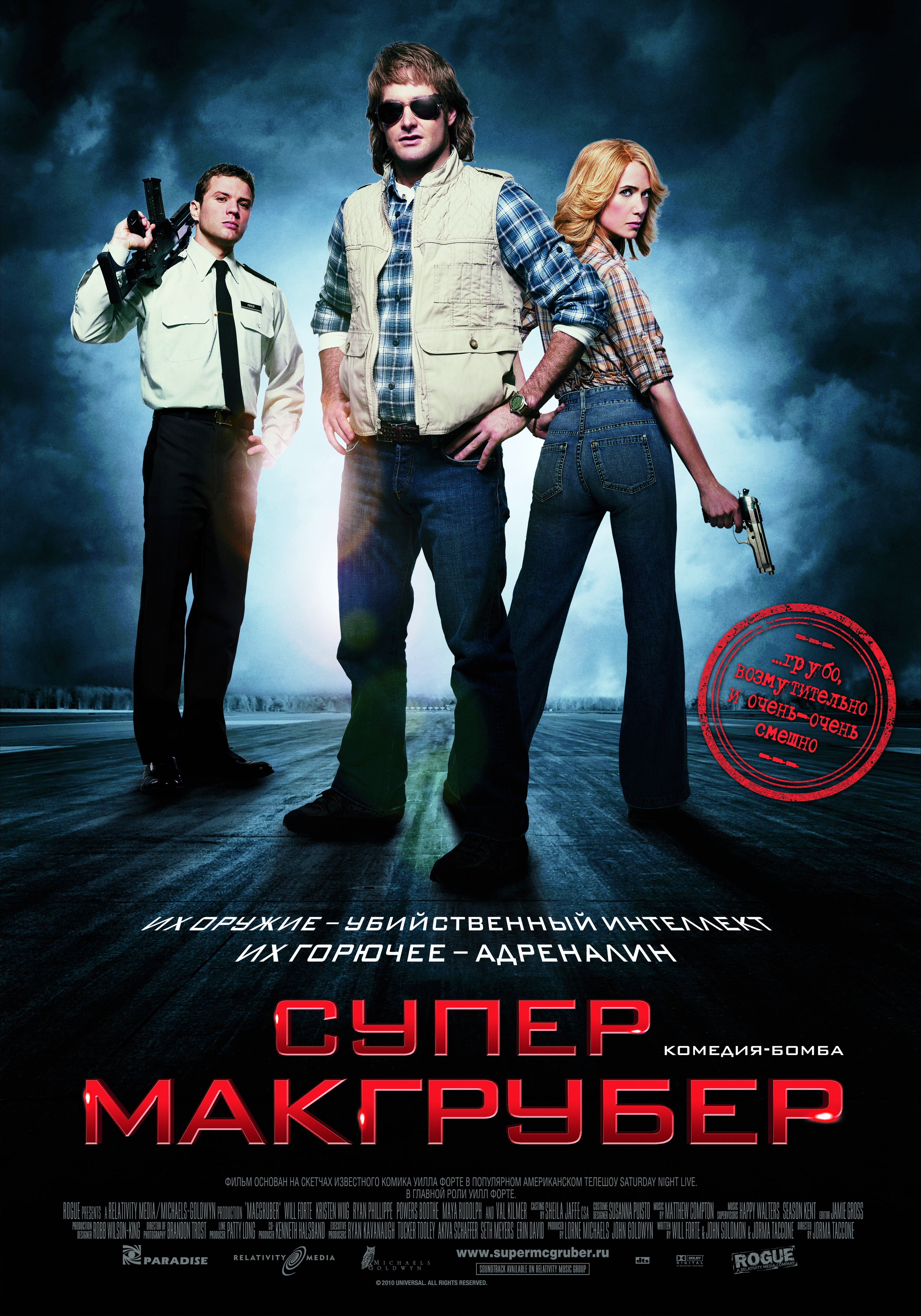 Но кроме перечислений того, что в фильме есть безбашенные приколы, надо ведь замолвить и об актёрах. Уил Форте, Кристен Уиг, Райан Филипп и несравненный Вэл Килмер в роли злодея.